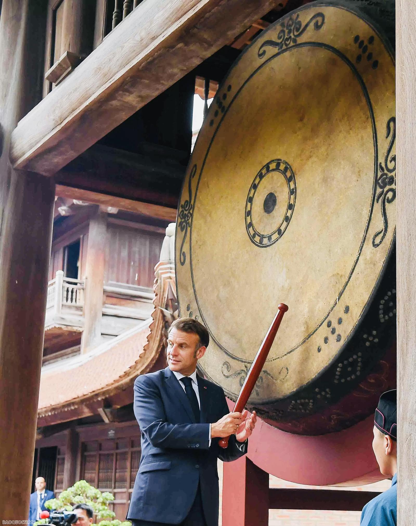 Tổng Bí thư Tô Lâm mời Tổng thống Pháp đánh 3 tiếng trống Sấm. Ảnh: Nguyên Hồng