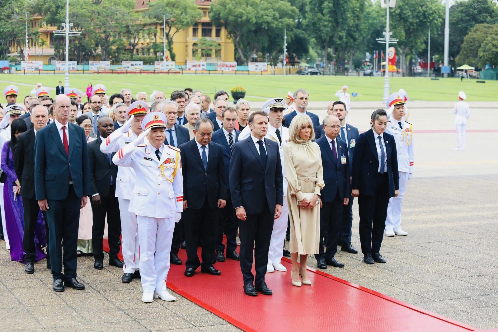 Tổng thống Pháp Emmanuel Macron và Phu nhân cùng các đại biểu kính cẩn tưởng niệm Chủ tịch Hồ Chí Minh. Ảnh: Hữu Hưng