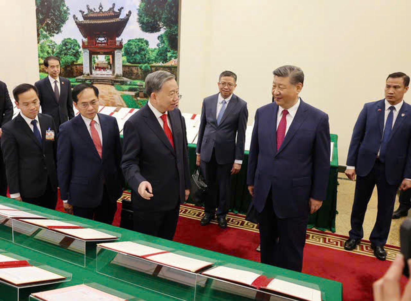 Tổng Bí thư Tô Lâm và Tổng Bí thư, Chủ tịch nước Trung Quốc Tập Cận Bình đã cùng xem và nghe giới thiệu về 45 văn bản thỏa thuận hợp tác. Ảnh: Hữu Hưng