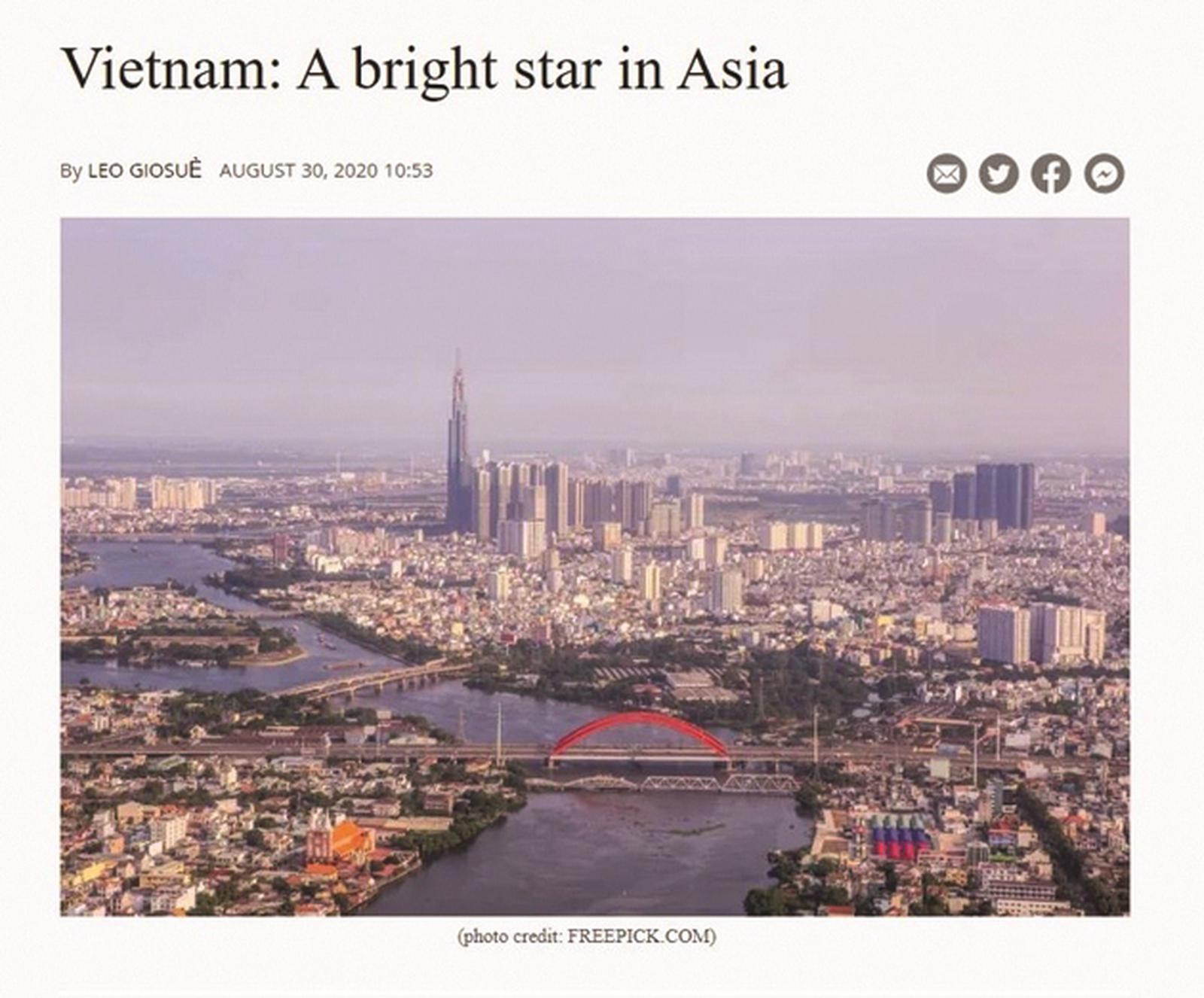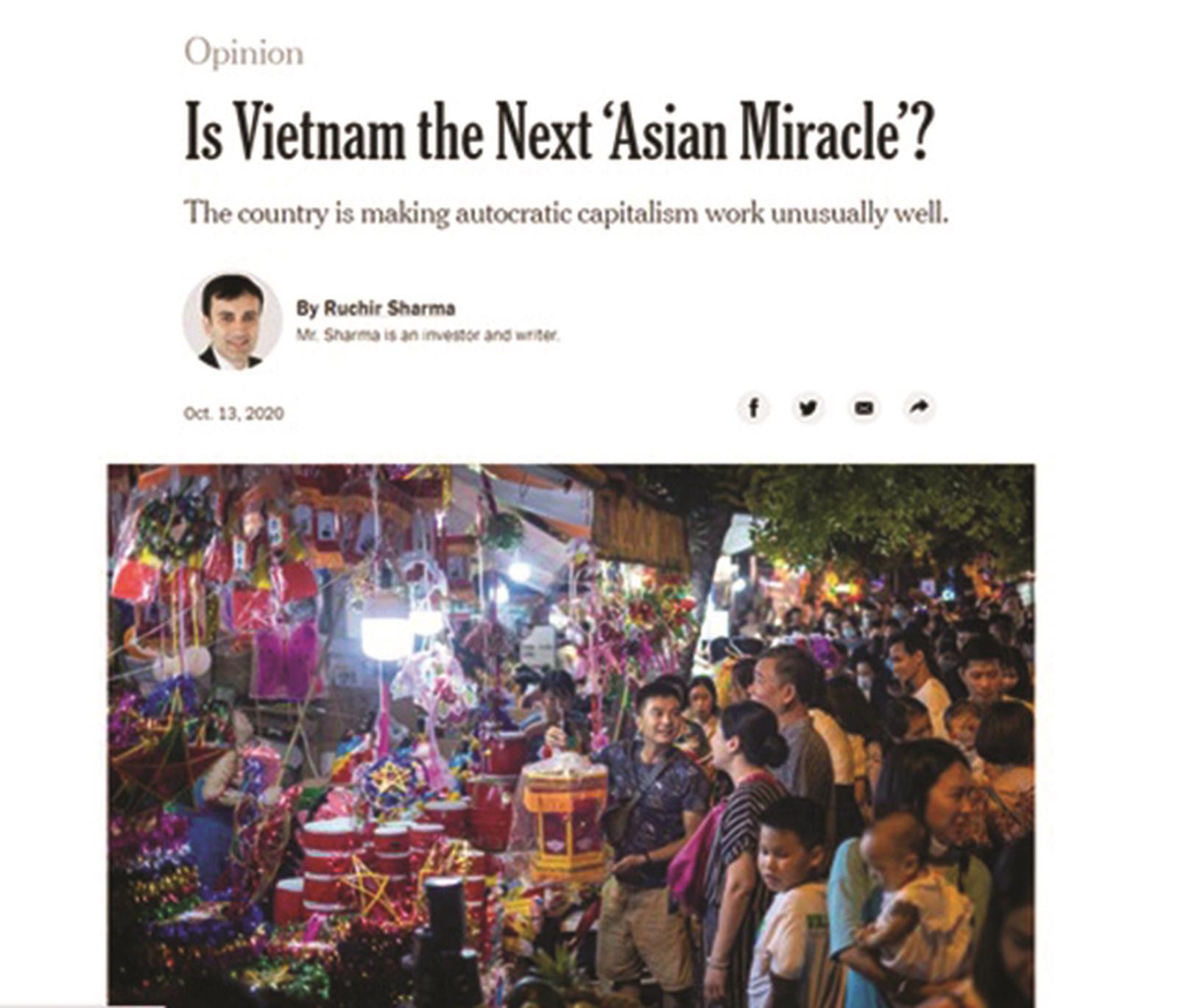 Bài viết “Việt Nam - Điều thần kỳ mới của châu Á?” của tác giả Ruchir Sharma, chiến lược gia trưởng toàn cầu của Bộ phận Quản lý đầu tư của Ngân hàng Đầu tư đa quốc gia Morgan Stanley đăng trên New York Times của Mỹ ngày 13/10/2020