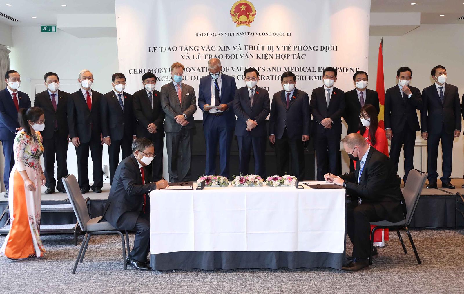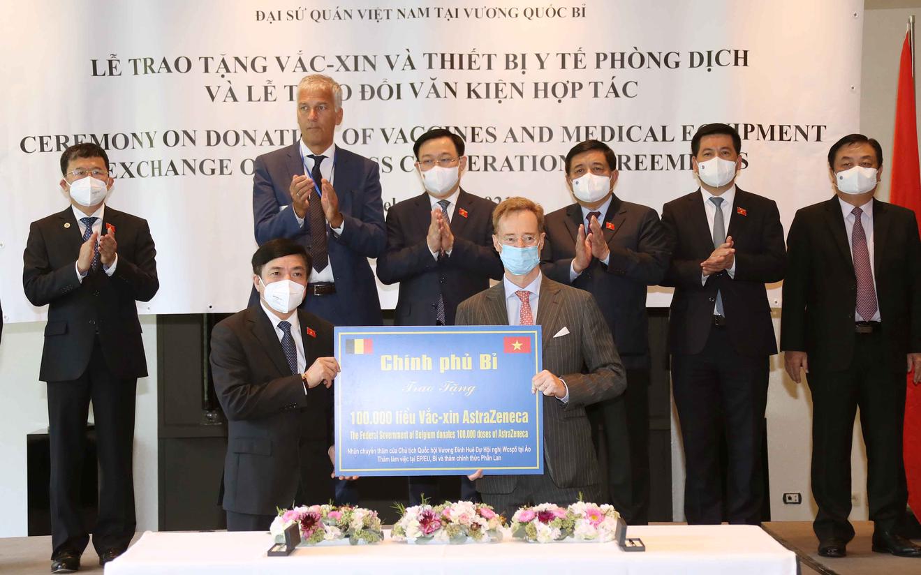 Trước sự chứng kiến của Chủ tịch Quốc hội và Đoàn Việt Nam, Đại sứ Đặc mệnh toàn quyền của Việt Nam tại Vương Quốc Bỉ, lãnh đạo Bộ Ngoại giao Bỉ, đại diện Bộ Ngoại giao Bỉ đã trao 100.000 liều vaccine AstraZeneca cho Việt Nam để hỗ trợ phòng chống dịch COVID-19.