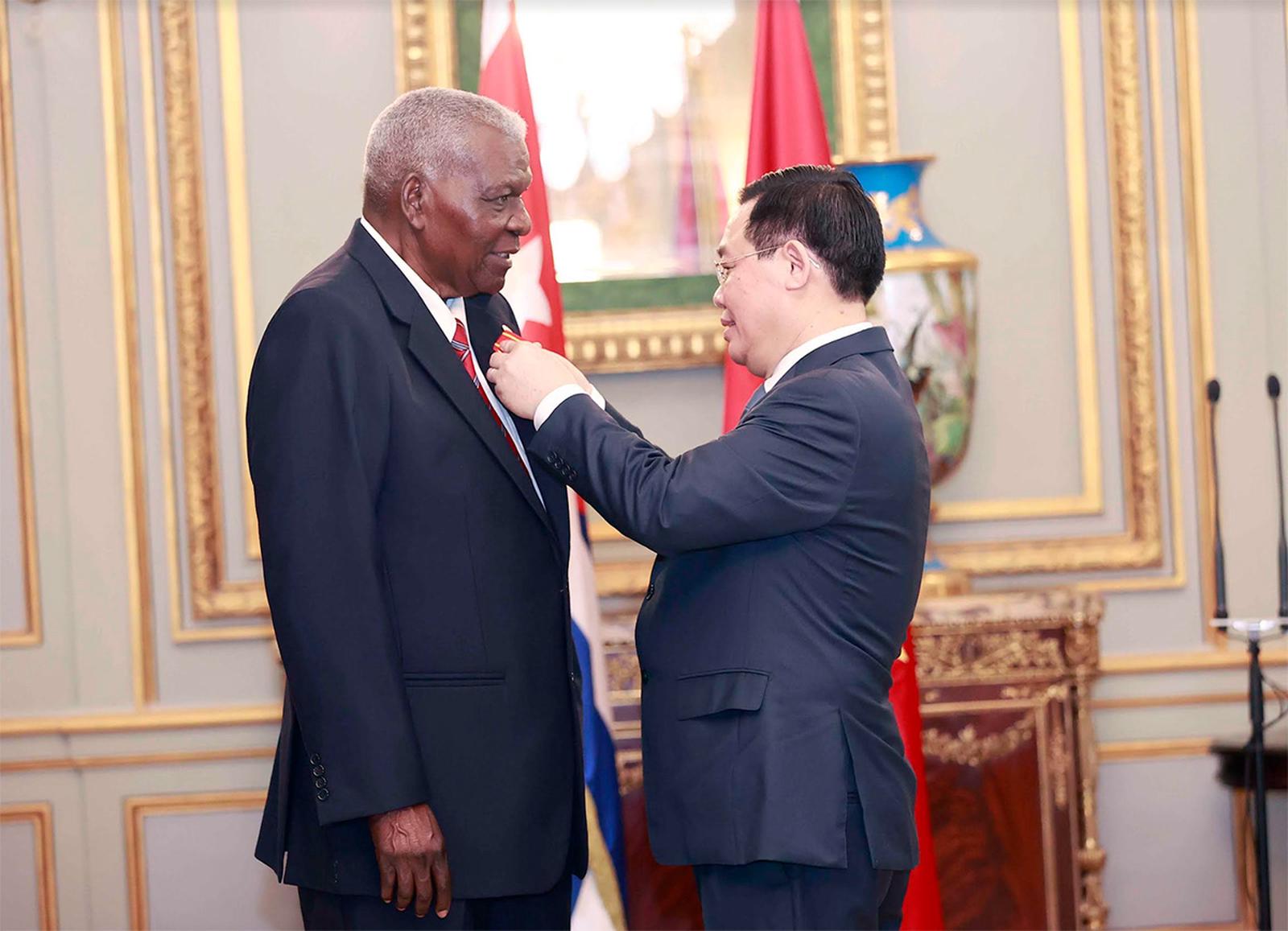 Chủ tịch Quốc hội Cuba được trao tặng Huân chương Hồ Chí Minh Cũng tối 20/4, giờ Việt Nam, Lễ trao phần thưởng cao quý của Nhà nước Việt Nam tặng Lãnh đạo Quốc hội Cuba được tổ chức trang trọng tại Nhà Quốc hội Cuba - Capitolio. Chủ tịch Quốc hội Vương Đình Huệ trao Huân chương Hồ Chí Minh tặng Chủ tịch Quốc hội Cuba Esteban Lazo Hernández. Ảnh Doãn Tấn Tại buổi lễ, Tổng Thư ký - Chủ nhiệm Văn phòng Quốc hội Bùi Văn Cường đã công bố các quyết định của Chủ tịch Nước Võ Văn Thưởng về việc trao tặng Huân chương Hồ Chí Minh và Huân chương Hữu nghị. Thay mặt Lãnh đạo Đảng và Nhà nước Việt Nam, Chủ tịch Quốc hội Vương Đình Huệ đã trao Huân chương Hồ Chí Minh tặng Chủ tịch Quốc hội Cuba Esteban Lazo Hernández. Đây là huân chương cao quý thứ hai của Đảng và Nhà nước Việt Nam, ghi nhận những công lao to lớn của Chủ tịch Quốc hội Esteban Lazo Hernández trong việc củng cố và phát triển quan hệ hữu nghị đặc biệt giữa hai Đảng, hai Quốc hội và Nhân dân hai nước Việt Nam - Cuba. Tiếp đó, Chủ tịch Quốc hội đã trao Huân chương Hữu nghị tặng Phó Chủ tịch Quốc hội Cuba Ana Maria Mari Machado, Tổng Thư ký Quốc hội và Hội đồng Nhà nước Cuba Homero Acosta Álvarez và Chủ nhiệm Ủy ban Đối ngoại của Quốc hội Cuba Maria Yolanda Ferrer vì những đóng góp tích cực trong việc thúc đẩy quan hệ hữu nghị truyền thống và hợp tác đặc biệt Việt Nam - Cuba. "Chúng tôi nhận danh hiệu cao quý này nhân danh Nhân dân Cuba - những người mà chúng tôi đại diện và với tình đoàn kết với Nhân dân Việt Nam anh hùng”, Chủ tịch Quốc hội Esteban Lazo Hernández bày tỏ và nhấn mạnh, “khi nói Việt Nam - Cuba, đoàn kết, nhất định thắng là chúng ta đang nói về sự đoàn kết trong quan niệm cao nhất của nó”.