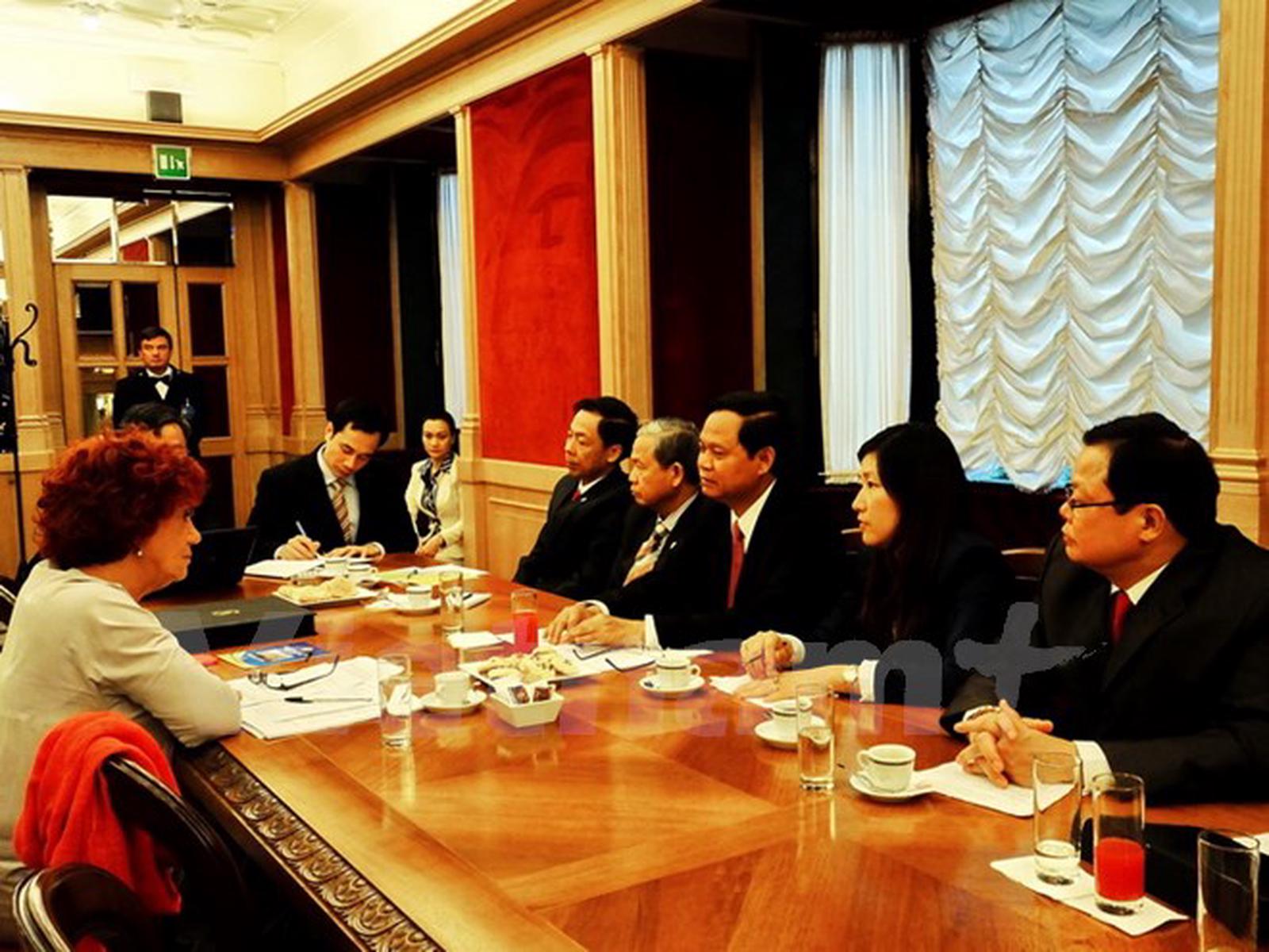 Tổng Thanh tra Chính phủ Huỳnh Phong Tranh hội kiến với Phó Chủ tịch Thượng viện Italy, bà Valeria Fedeli. (Ảnh: Quang Thanh/Vietnam+)