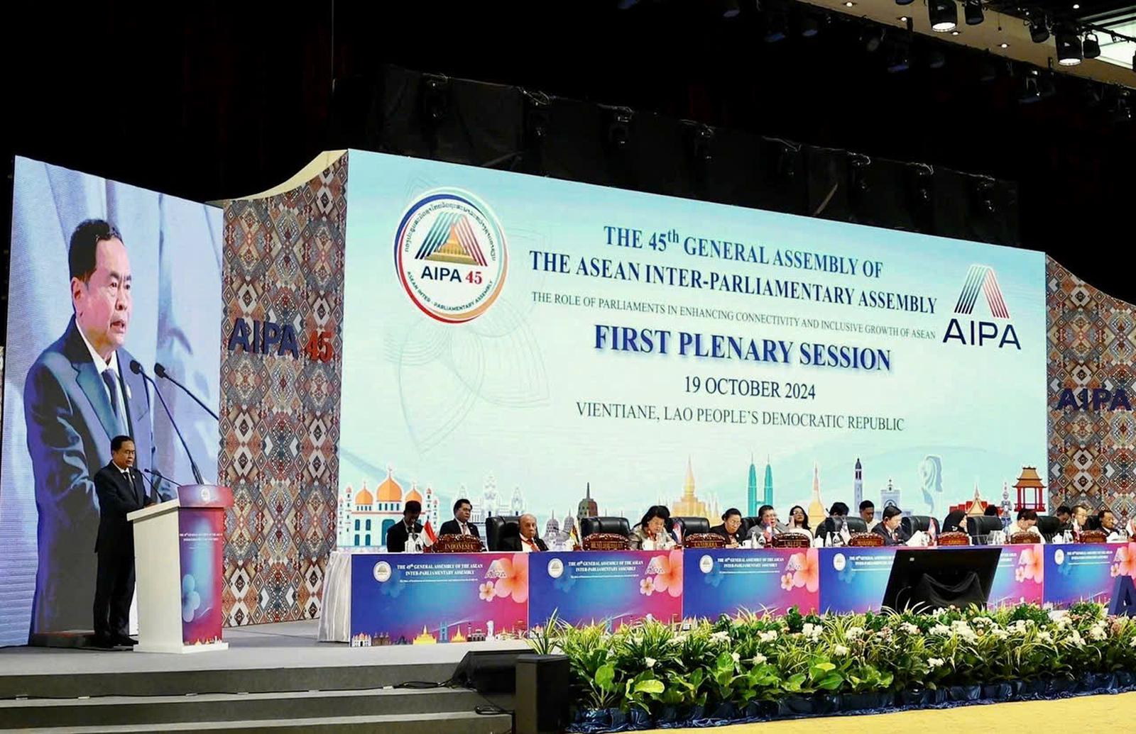 Tại Trung tâm Hội nghị Quốc gia ở Thủ đô Vientiane, Lào, Chủ tịch Quốc hội Trần Thanh Mẫn phát biểu tại Phiên họp toàn thể thứ nhất Đại hội đồng AIPA-45 (tháng 10/2024). Ảnh: Thống Nhất