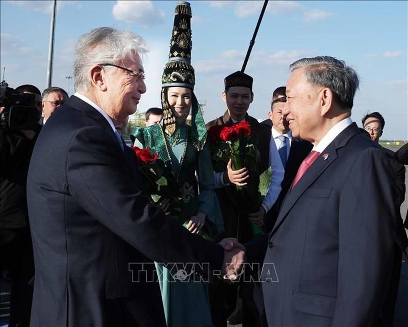 Tổng thống Kazakhstan Kassym-Jomart Tokayev đón Tổng Bí thư Tô Lâm tại Sân bay Quốc tế Nursultan Nazarbayev, Thủ đô Astana. Ảnh: TTXVN
