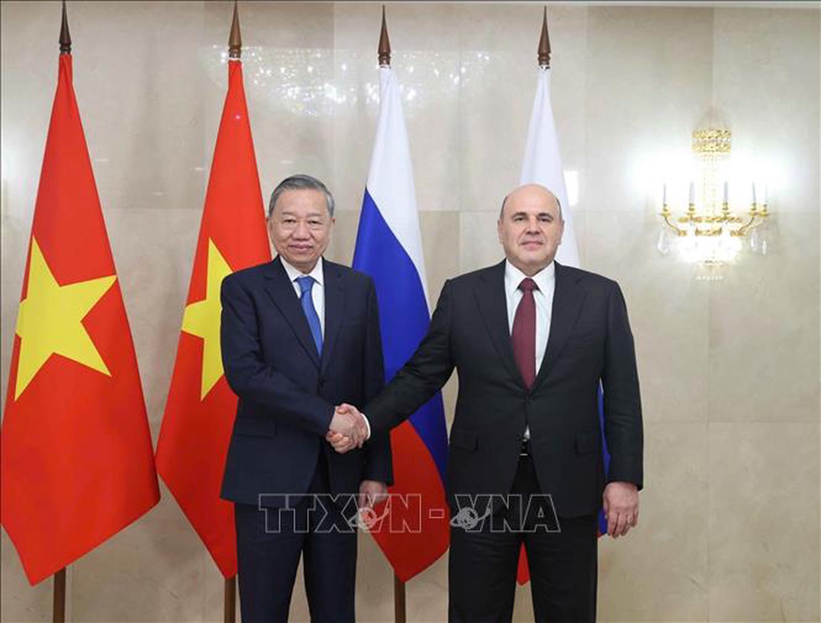 Tổng Bí thư Tô Lâm và Thủ tướng Liên bang Nga Mikhail Mishustin. Ảnh: TTXVN