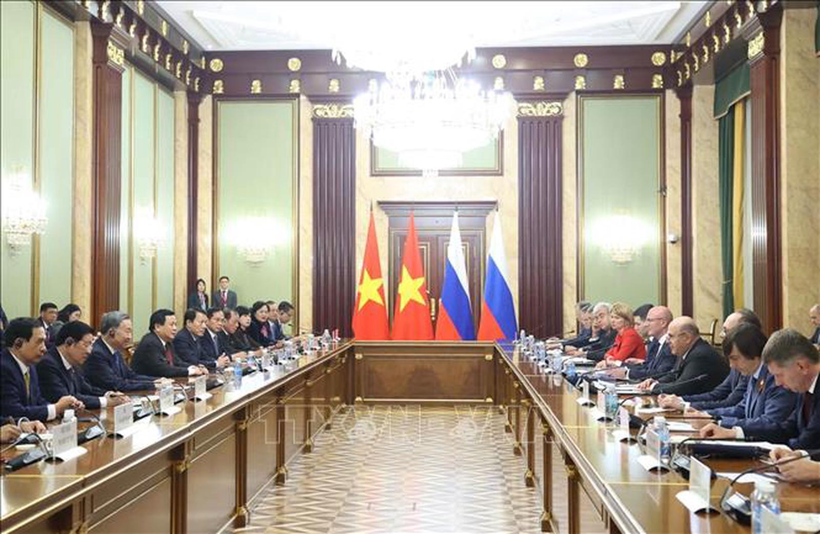 Nhắc lại kết quả tốt đẹp của chuyến thăm chính thức Việt Nam của Thủ tướng Mikhail Mishustin vào tháng 1/2025, cũng như chuyến thăm cấp Nhà nước đến Việt Nam của Tổng thống Vladimir Putin tháng 6/2024, Tổng Bí thư Tô Lâm khẳng định chuyến thăm lần này của Đoàn đại biểu cấp cao Việt Nam thể hiện sự coi trọng của Đảng, Nhà nước Việt Nam đối với quan hệ hữu nghị truyền thống và Đối tác Chiến lược toàn diện Việt Nam-Liên bang Nga, cũng như quyết tâm chính trị cao của cả hai bên trong việc làm sâu sắc hơn nữa quan hệ song phương.