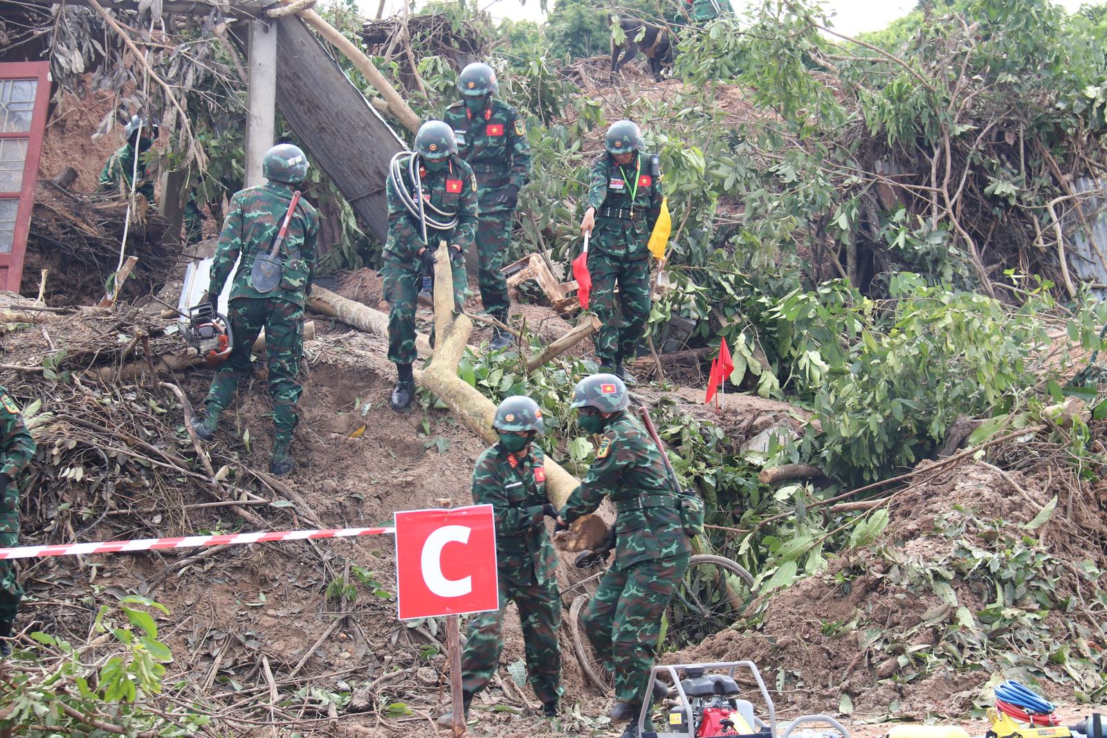 Đối với kịch bản tìm kiếm, cứu nạn giúp đỡ người gặp nạn do sạt lở đất, khi nhận được báo cáo về sự cố, lực lượng Quân đội ba nước đã nhanh chóng tiến hành thu thập thông tin và thống kê công dân tại khu vực xảy ra thiên tai.