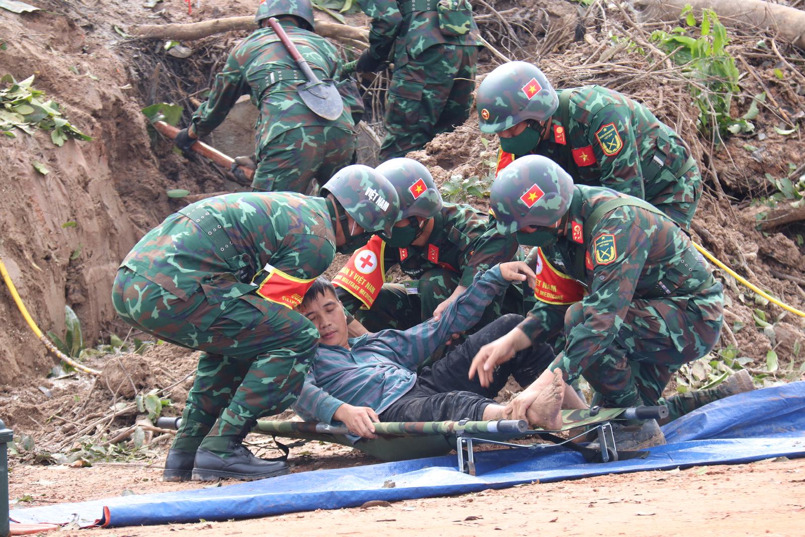 Diễn tập cứu nạn nhân trong vụ sạt lở đất. Ảnh: Bộ Quốc phòng cung cấp