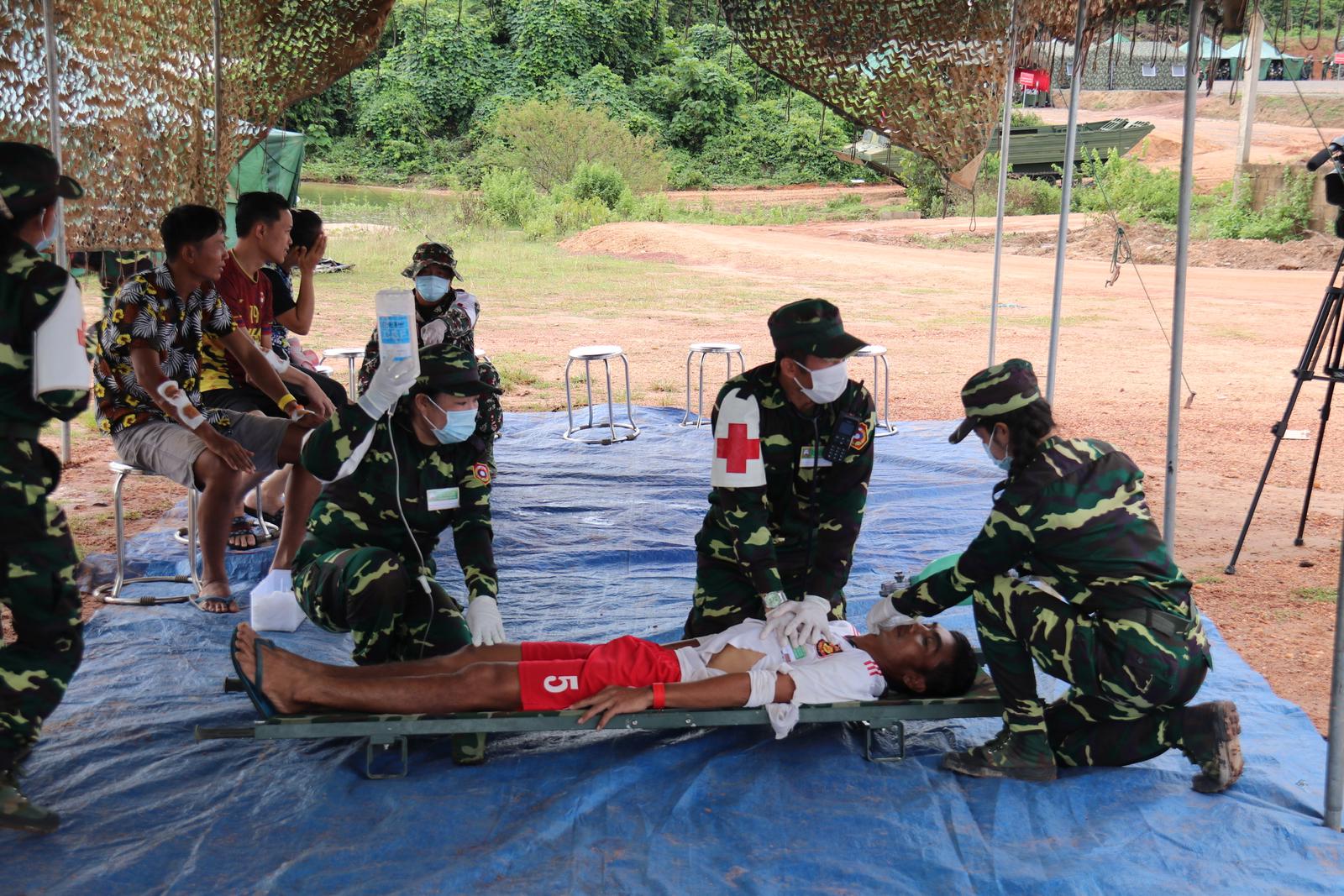 Tiến hành sơ cứu nạn nhân trước khi di chuyển về Bệnh viện dã chiến.Ảnh: Bộ Quốc phòng cung cấp