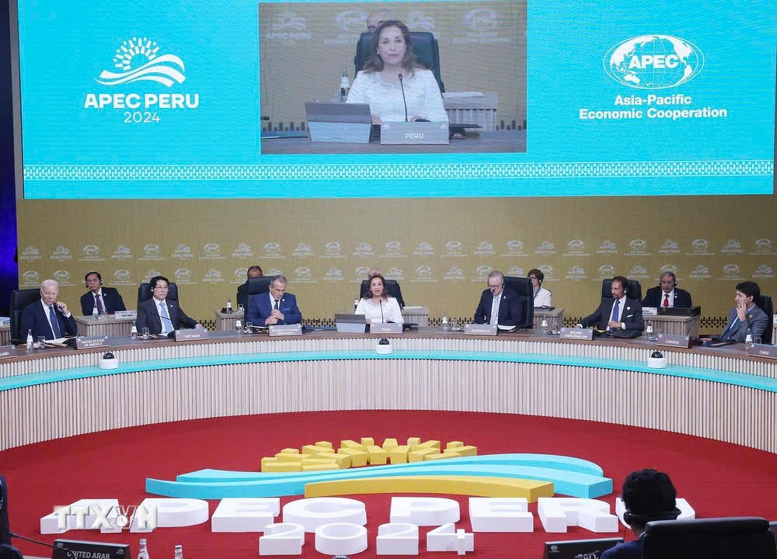 Phiên đối thoại năm nay có sự tham dự của các nhà lãnh đạo, Trưởng đoàn 21 nền kinh tế thành viên APEC và ba đối tác khách mời là đại diện lãnh đạo Các Tiểu vương quốc Ảrập Thống nhất (UAE), Tổ chức Lương thực và Nông nghiệp Liên hợp quốc (FAO), và Ngân hàng Phát triển Mỹ Latinh và Caribê (CAF). Ảnh: TTXVN