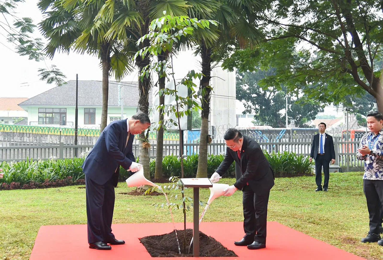 Tổng Bí thư Tô Lâm và Tổng Thư ký ASEAN Kao Kim Hourn trồng cây lưu niệm tại trụ sở Ban Thư ký ASEAN. Ảnh:TGVN/Tuấn Anh