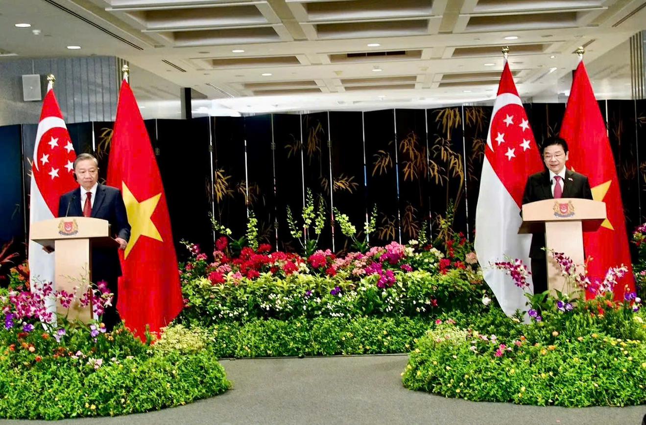 Tổng Bí thư Tô Lâm và Thủ tướng Cộng hòa Singapore, Tổng Thư ký Đảng PAP Lawrence Wong chủ trì cuộc gặp báo chí thông tin về kết quả hội đàm và chính thức công bố nâng cấp quan hệ Việt Nam - Singapore lên Đối tác Chiến lược toàn diện. Ảnh: TGVN/Văn Hiếu