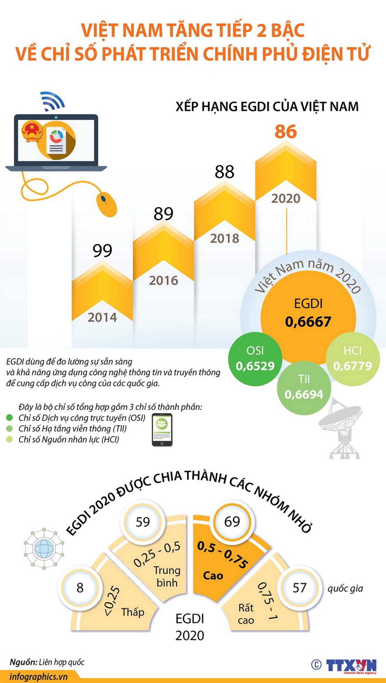 Theo báo cáo của Liên hợp quốc về Chỉ số Phát triển Chính phủ Điện tử (EGDI) 2020, Việt Nam thuộc nhóm nước có chỉ số cao và xếp hạng 86, tăng 2 bậc so với năm 2018.