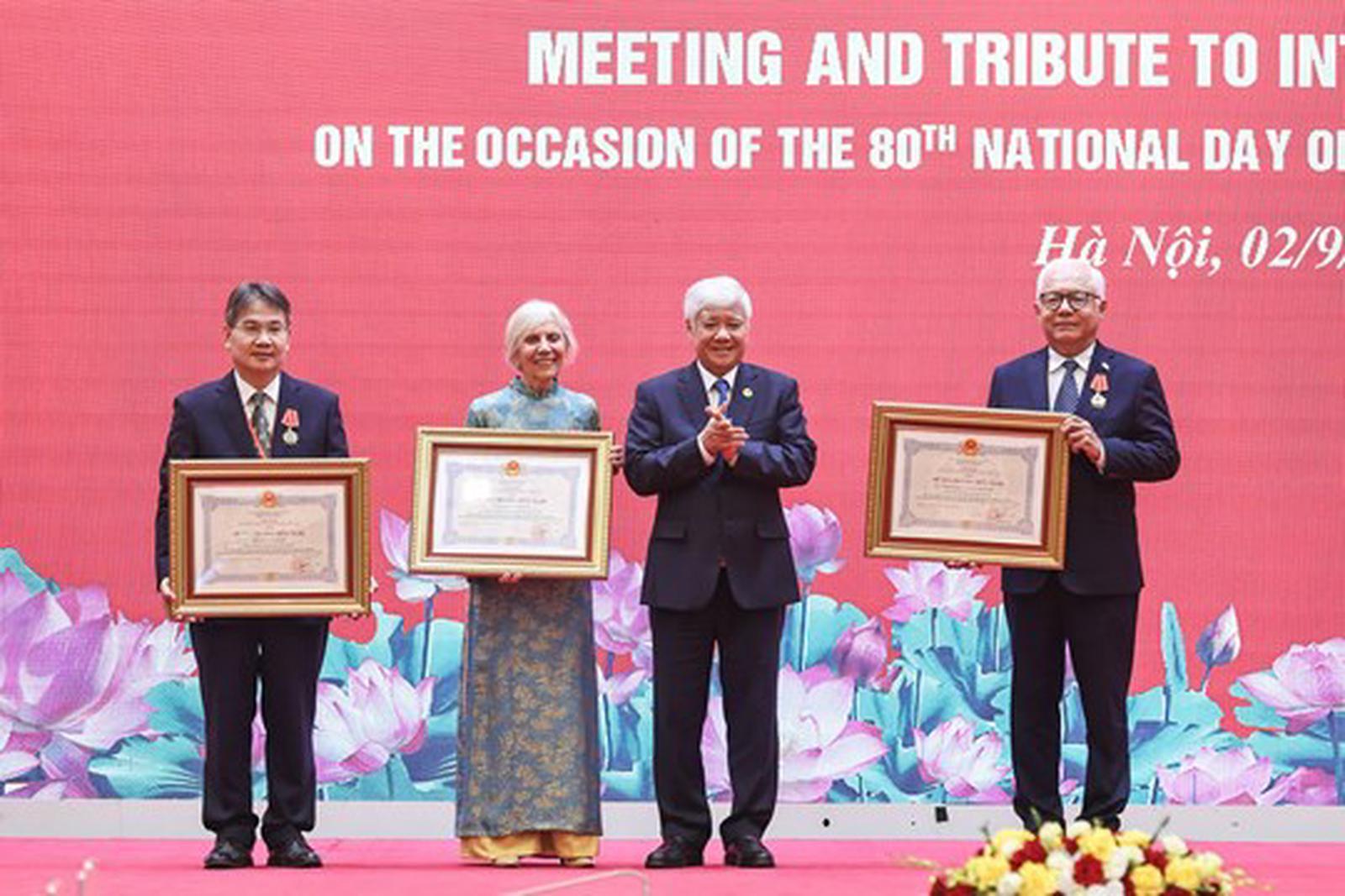 Ông Đỗ Văn Chiến, Ủy viên Bộ Chính trị, Bí thư Trung ương Đảng, Chủ tịch Ủy ban Trung ương MTTQ Việt Nam trao tặng Huân chương Hữu nghị của Chủ tịch nước Cộng hòa xã hội chủ nghĩa Việt Nam cho 3 tập thể và cá nhân để ghi nhận những đóng góp của bạn bè quốc tế đối với sự nghiệp xây dựng và bảo vệ Tổ quốc của Việt Nam. Ảnh: Quang Vinh