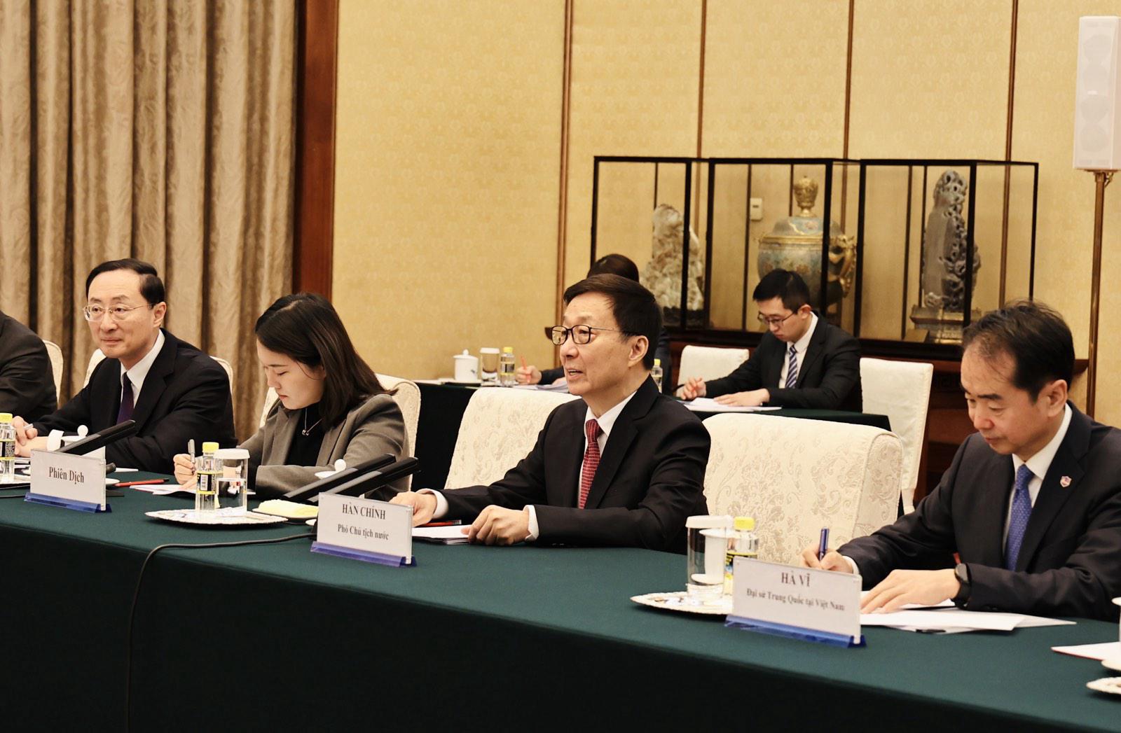 Phó Chủ tịch nước Hàn Chính trân trọng chuyển lời thăm hỏi, lời chúc tốt đẹp của các đồng chí lãnh đạo cấp cao Trung Quốc đến các đồng chí lãnh đạo Đảng, Nhà nước Việt Nam.