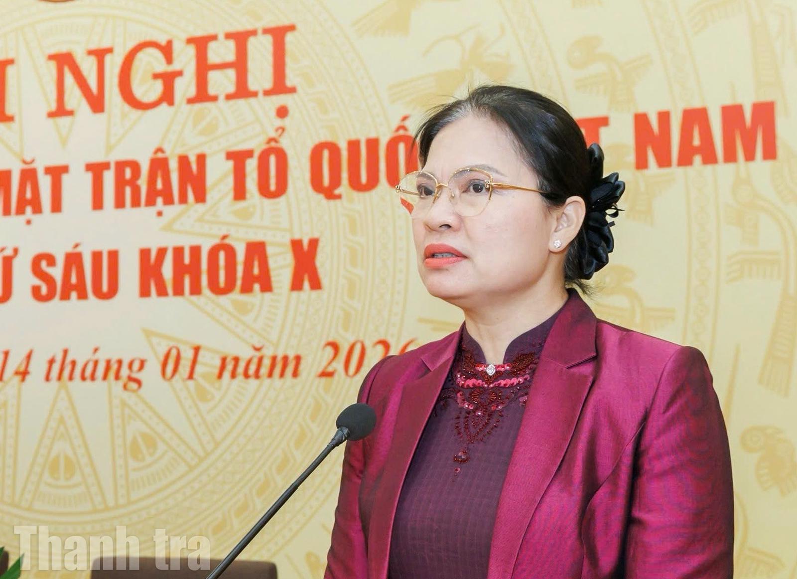 Bà nhấn mạnh, trong bối cảnh MTTQ các cấp hoạt động trong mô hình mới, vai trò và vị thế của MTTQ ngày càng được khẳng định rõ nét trong hệ thống chính trị và đời sống Nhân dân; đồng thời cam kết cùng tập thể Ban Thường trực, Đoàn Chủ tịch và UBTƯ MTTQ Việt Nam đoàn kết, thống nhất để hoàn thành tốt nhiệm vụ được giao.