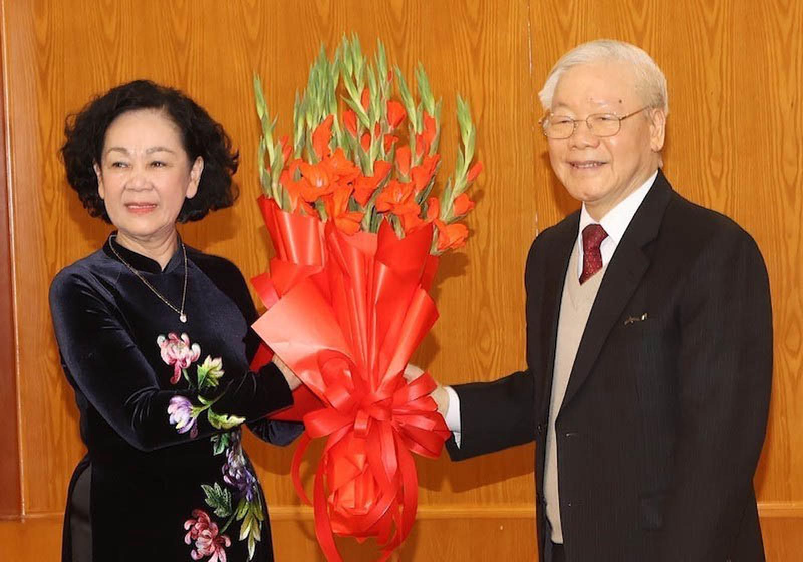 Tổng Bí thư tặng hoa chúc mừng Thường trực Ban Bí thư Trương Thị Mai. Ảnh: TTXVN