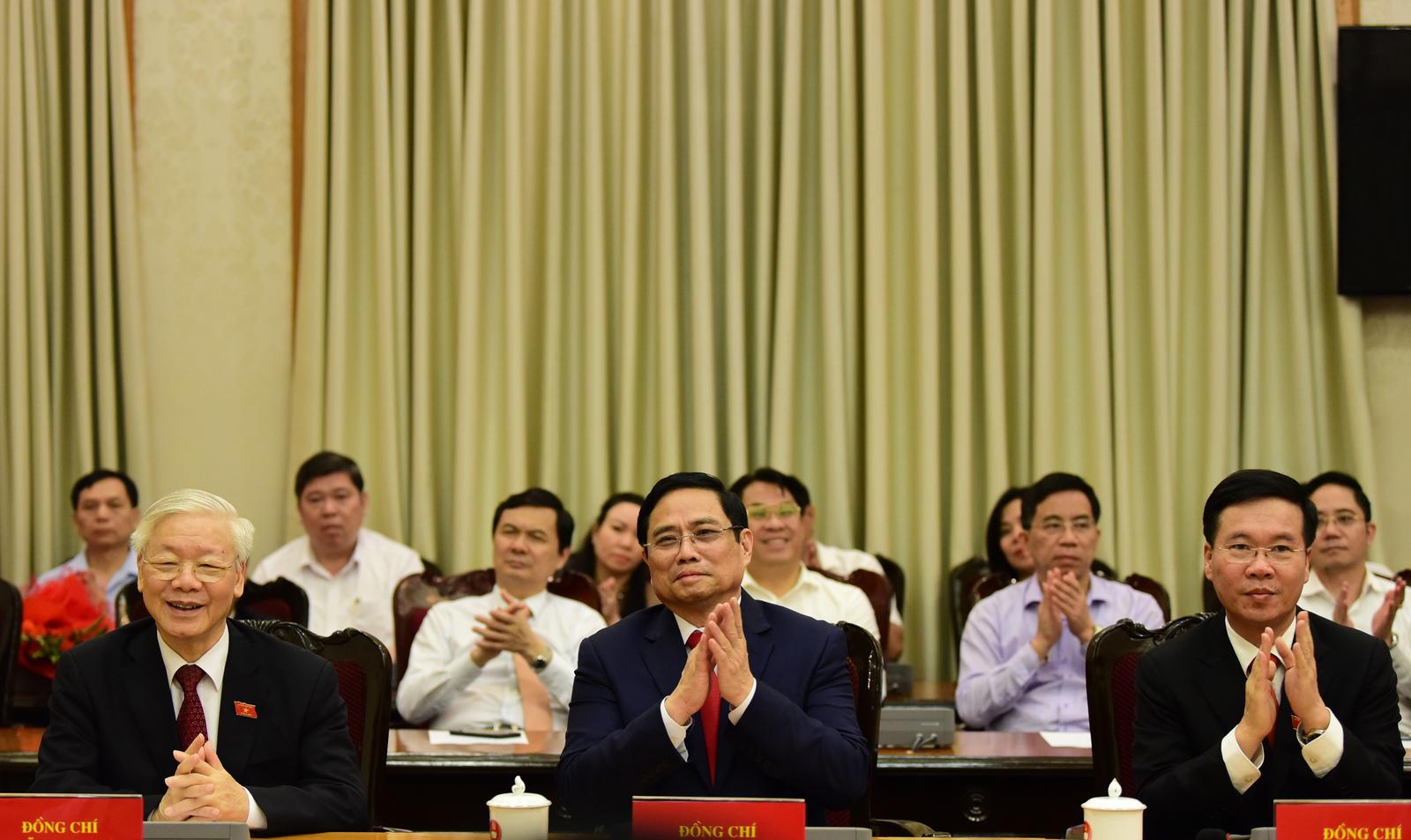 Tổng Bí thư Nguyễn Phú Trọng, Thủ tướng Chính phủ Phạm Minh Chính, Thường trực Ban Bí thư Võ Văn Thưởng, cùng lãnh đạo Ban Tổ chức Trung ương, Ủy ban Kiểm tra Trung ương, Ban Dân vận Trung ương… dự hội nghị. Ảnh: Đ.X