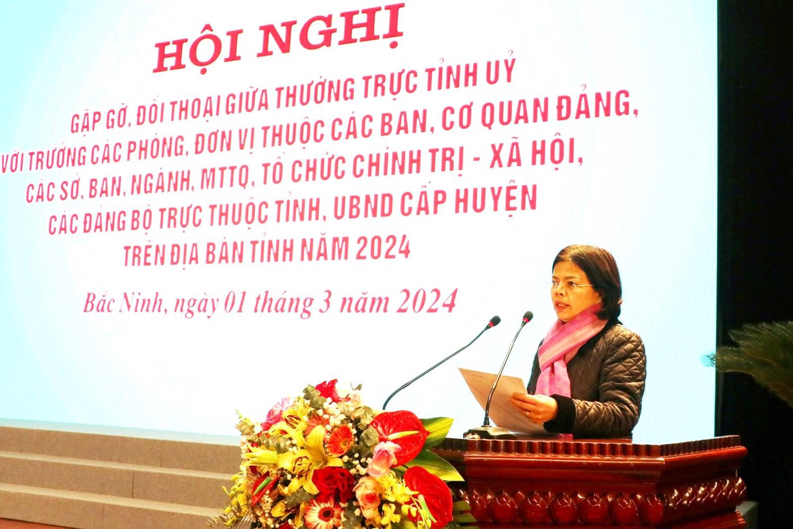 Tại buổi đối thoại, Chủ tịch UBND tỉnh Bắc Ninh Nguyễn Hương Giang đã báo cáo kết quả thực hiện nhiệm vụ chính trị của tỉnh năm 2023 và phương hướng, nhiệm vụ năm 2024; những khó khăn, vướng mắc, đề xuất, kiến nghị của trưởng các phòng thuộc các ban, cơ quan Đảng, các sở, ngành, MTTQ và các tổ chức chính trị - xã hội tỉnh, các huyện ủy, thị ủy, thành ủy, UBND các huyện, thị xã, TP.