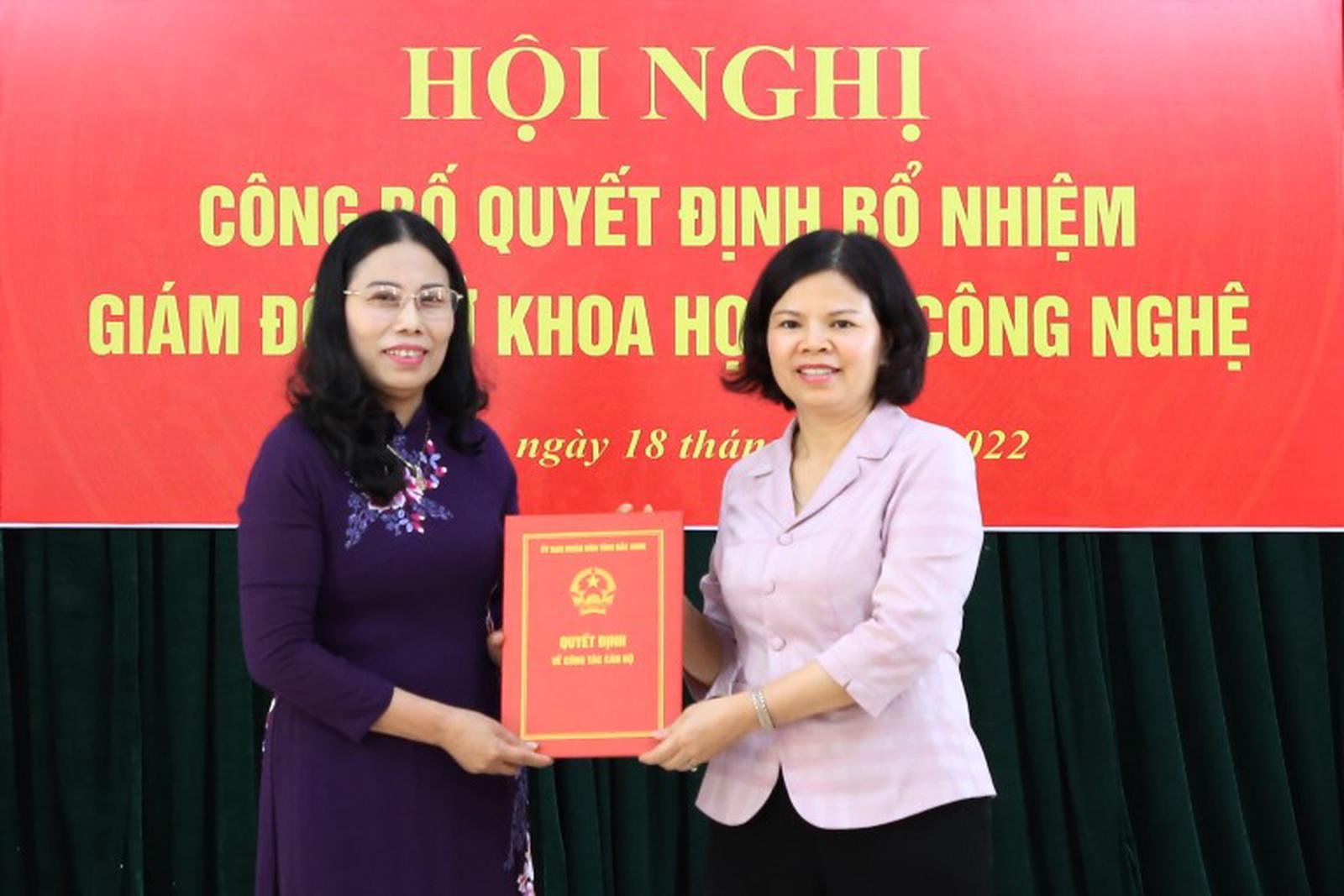Bà Nguyễn Hương Giang, Chủ tịch UBND tỉnh trao Quyết định bổ nhiệm bà Nguyễn Thị Dung làm Giám đốc Sở Khoa học và Công nghệ. Ảnh: T.L
