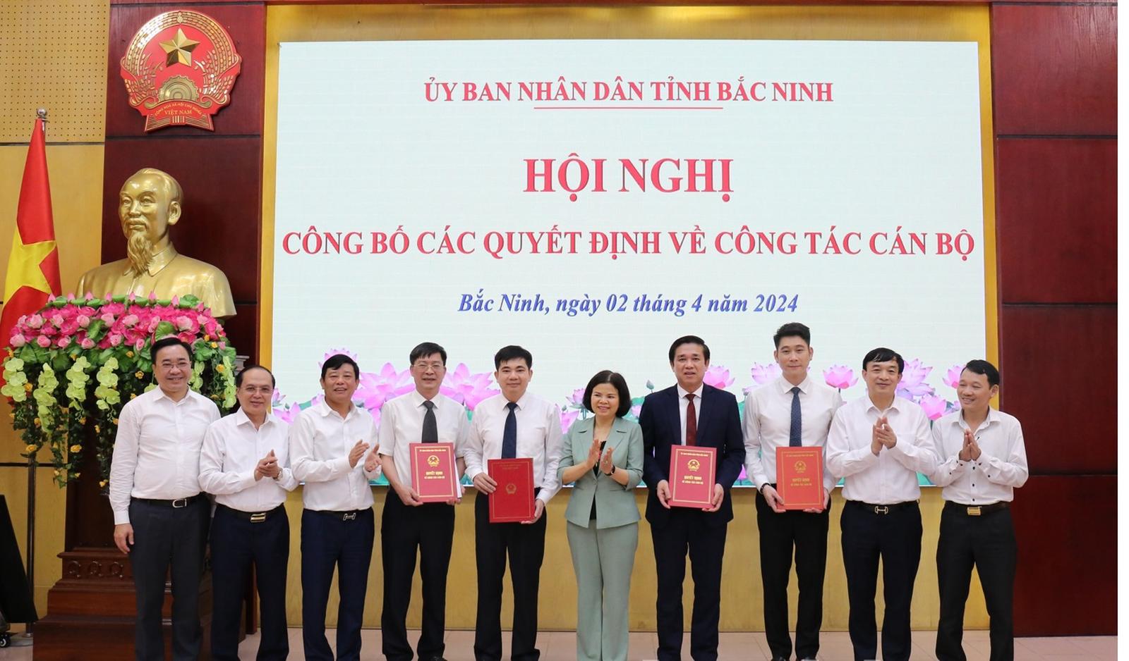 Cũng trong chiều 2/4, UBND tỉnh Bắc Ninh tổ chức hội nghị công bố các quyết định về công tác cán bộ. Chủ tịch UBND tỉnh Nguyễn Hương Giang trao các quyết định về công tác cán bộ. Ảnh:A.T Tại hội nghị, Giám đốc Sở Nội vụ công bố các quyết định của Chủ tịch UBND tỉnh về việc tiếp nhận, điều động và bổ nhiệm ông Lê Đức Kỳ, Phó Chủ tịch Thường trực Ủy ban MTTQ tỉnh, đến giữ chức Giám đốc Trung tâm Hành chính công tỉnh. Tiếp nhận, điều động và bổ nhiệm ông Ngô Văn Khương, Giám đốc Quỹ Phát triển đất, đến giữ chức Phó Giám đốc Sở Tài chính. Đồng thời, tiếp nhận, điều động và bổ nhiệm ông Nguyễn Như Hùng, Phó Trưởng Ban Kinh tế - Ngân sách, HĐND tỉnh, đến giữ chức Phó Giám đốc Sở Tài chính. Điều động và bổ nhiệm ông Đinh Phan Đại, Chuyên viên Văn phòng UBND tỉnh, đến giữ chức Phó Giám đốc Sở Giao thông Vận tải.