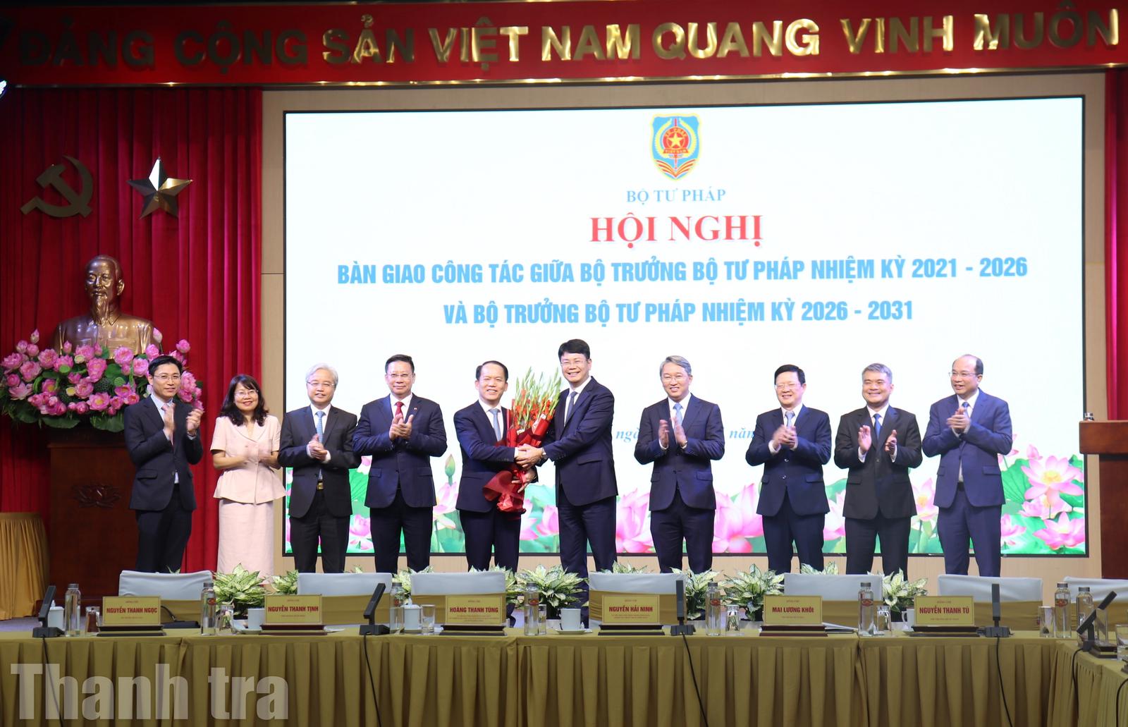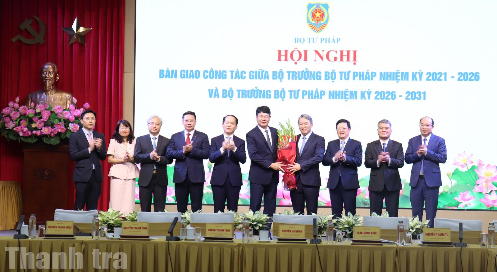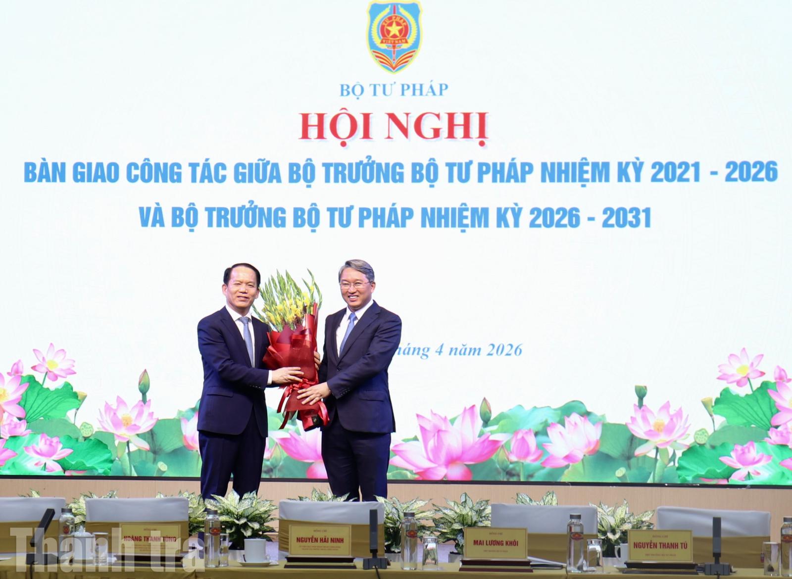Hai Bộ trưởng Bộ Tư pháp nhiệm kỳ 2021-2026 và Bộ trưởng nhiệm kỳ 2026-2031 bàn giao công tác. Ảnh: Phạm Kiên