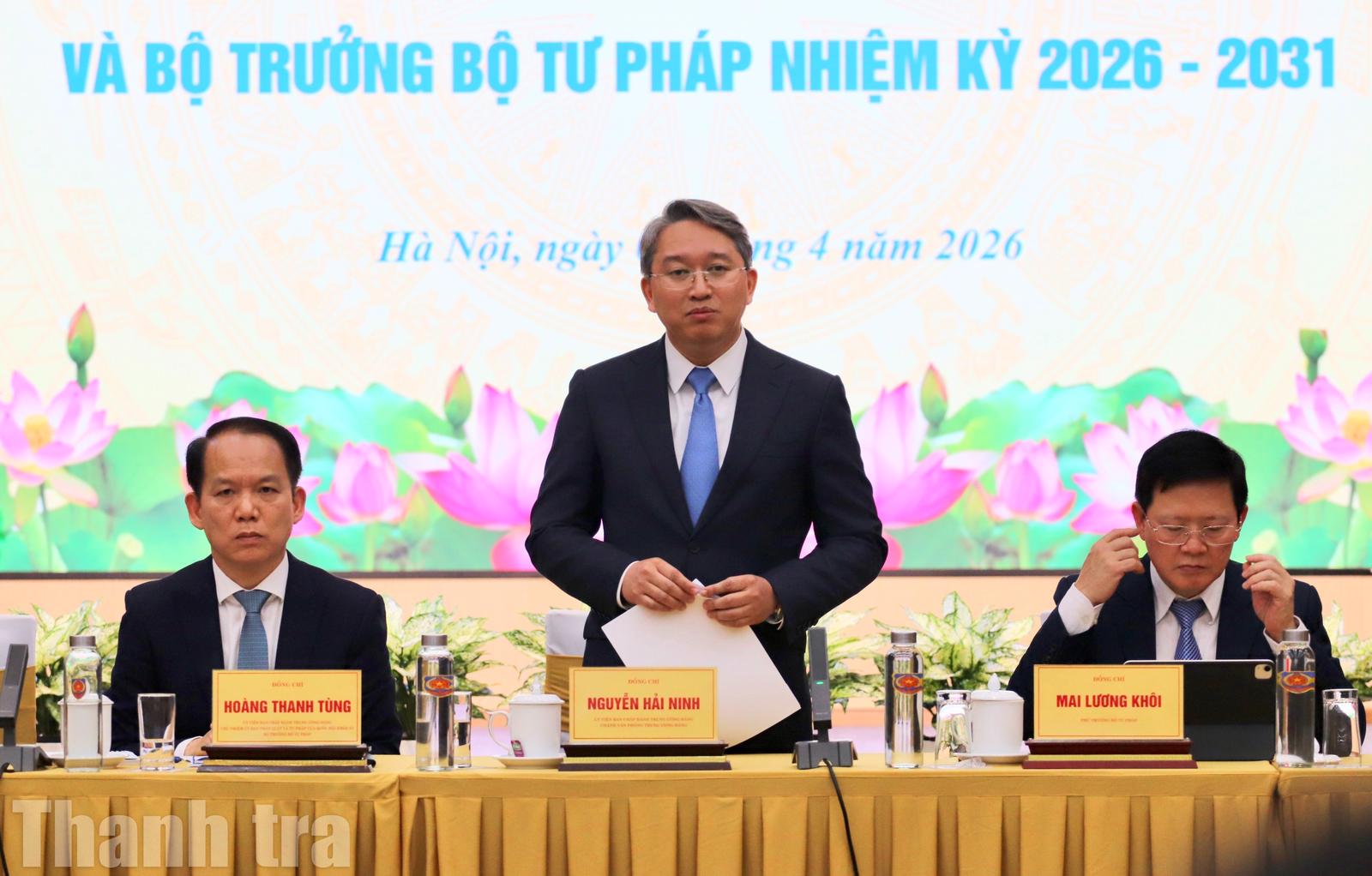 Chánh Văn phòng Trung ương Đảng, Bộ trưởng Bộ Tư pháp nhiệm kỳ 2021-2026 Nguyễn Hải Ninh phát biểu. Ảnh: Minh Nguyệt