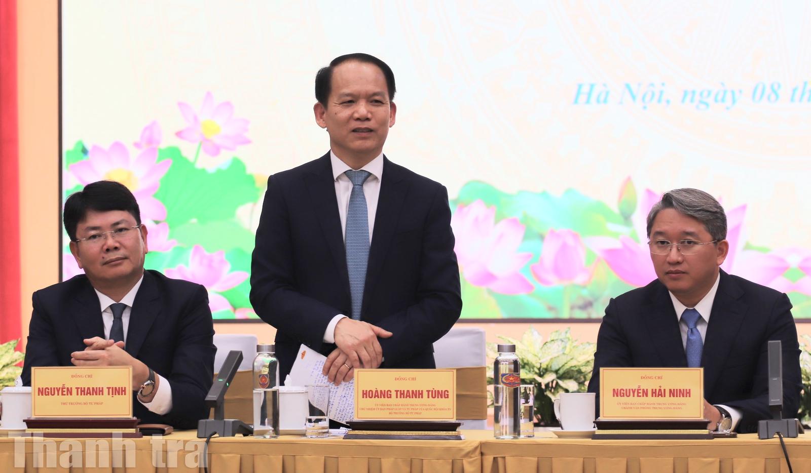 Chúc mừng Bộ trưởng Bộ Tư pháp Hoàng Thanh Tùng nhận nhiệm vụ mới, Chánh Văn phòng Trung ương Đảng Nguyễn Hải Ninh cũng mong tập thể Bộ Tư pháp sẽ tiếp tục đoàn kết để tham mưu, giúp việc cho tân Bộ trưởng hoàn thành xuất sắc nhiệm vụ mà Đảng và Nhà nước giao.