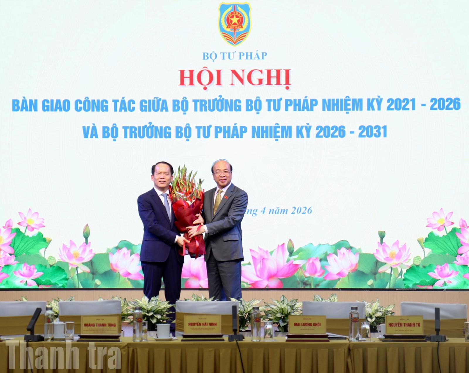 Bộ trưởng Bộ Tư pháp nhiệm kỳ 2021-2026 và Bộ trưởng Bộ Tư pháp nhiệm kỳ 2026-2031. Ảnh: Minh Nguyệt
