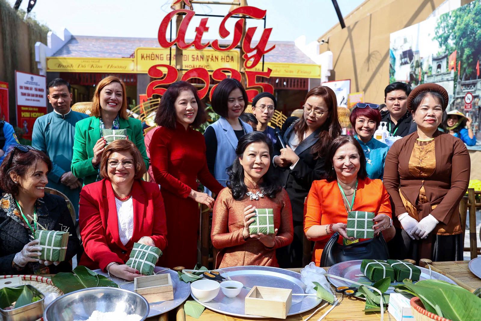 Các đại biểu cũng vô cùng ấn tượng khi được Phu nhân Tổng Bí thư và các nghệ nhân trực tiếp hướng dẫn từng bước tỉ mỉ từ việc chọn lá dong xanh, xếp lá, cho gạo nếp, đỗ xanh, thịt lợn, đến cách gói bánh vuông vức bằng dây lạt, rồi luộc bánh chưng. Các nhà ngoại giao cũng có dịp sum vầy bên mâm cỗ cổ truyền ngày tết như những người thân trong một gia đình lớn.