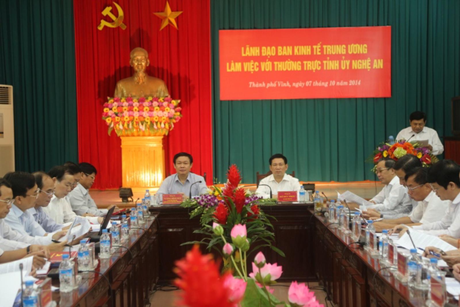 Đoàn Công tác Ban Kinh tế Trung ương đã làm việc với Thường trực Tỉnh ủy Nghệ An về kết quả thực hiện các chỉ tiêu Nghị quyết Đại hội Đảng bộ tỉnh Nghệ An lần thứ XVII; 1 năm thực hiện Nghị quyết 26-NQ/TW của Bộ Chính trị và tình hình kinh tế - xã hội 9 tháng của năm 2014; tình hình tái cơ cấu, chuyển đổi mô hình tăng trưởng, trọng tâm là tái cơ cấu ngành nông nghiệp và phát triển nông thôn; tình hình thực hiện Kết luận 56 ngày 21/2/2012 của Bộ Chính trị về tiếp tục đổi mới, phát triển và nâng cao hiệu quả kinh tế tập thể; xác định nhiệm vụ, giải pháp phát triển kinh tế - xã hội của tỉnh Nghệ An trong nhiệm kỳ tới (2015 - 2020); đóng góp vào việc xây dựng Văn kiện Đại hội Đảng bộ tỉnh Nghệ An khóa XVIII và Văn kiện Đại hội XII của Đảng.