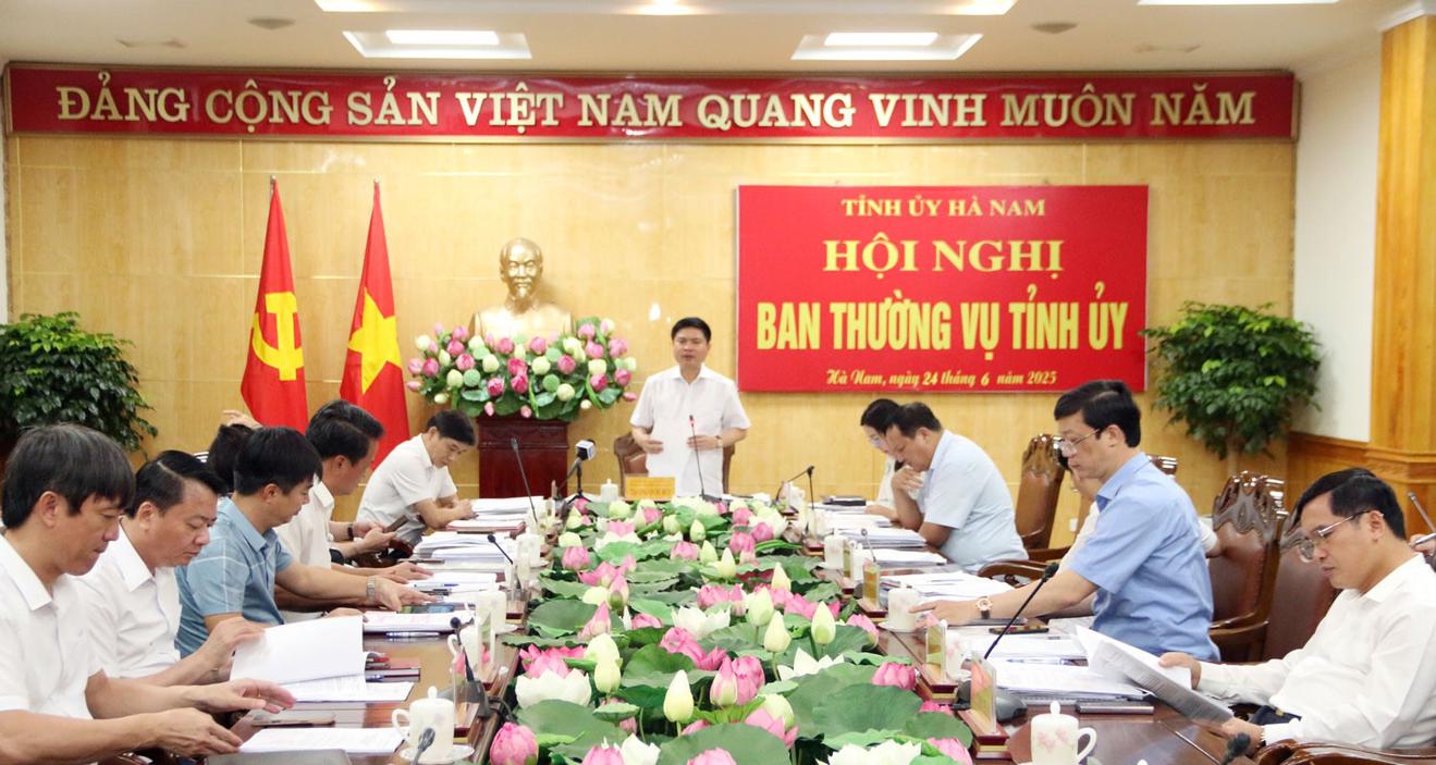 (Thanh tra) - Ngày 24/6, Ban Thường vụ Tỉnh ủy Hà Nam tổ chức hội nghị thảo luận, cho ý kiến, chủ trương các nội dung kinh tế - xã hội; cho ý kiến dự thảo báo cáo kết quả công tác 6 tháng đầu năm, nhiệm vụ trọng tâm 6 tháng cuối năm 2025 của Tỉnh ủy và các nội dung khác theo thẩm quyền.