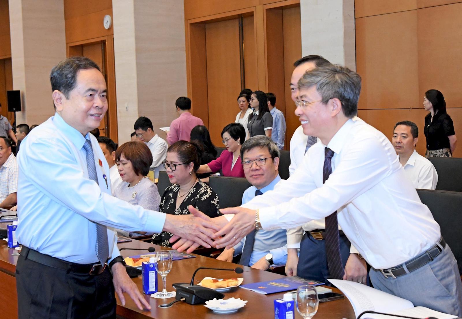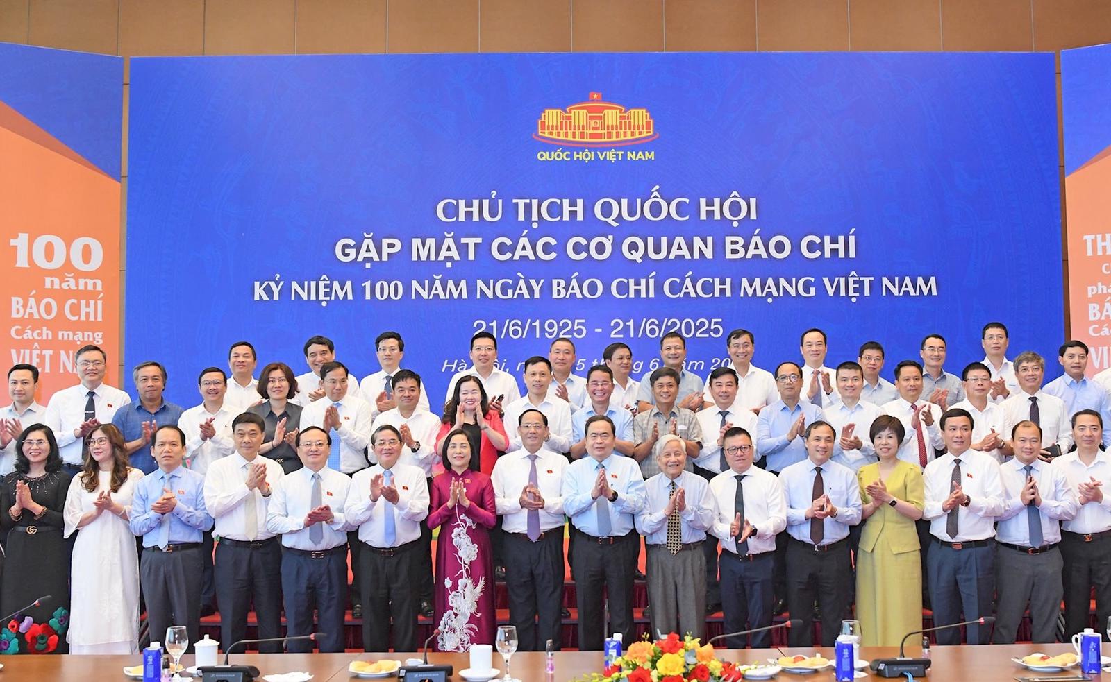 Chủ tịch Quốc hội Trần Thanh Mẫn cùng các Phó Chủ tịch Quốc hội, các Ủy viên Ủy ban Thường vụ Quốc hội gặp mặt các cơ quan báo chí nhân kỷ niệm 100 năm Ngày Báo chí Cách mạng Việt Nam. Ảnh: L.Hiển