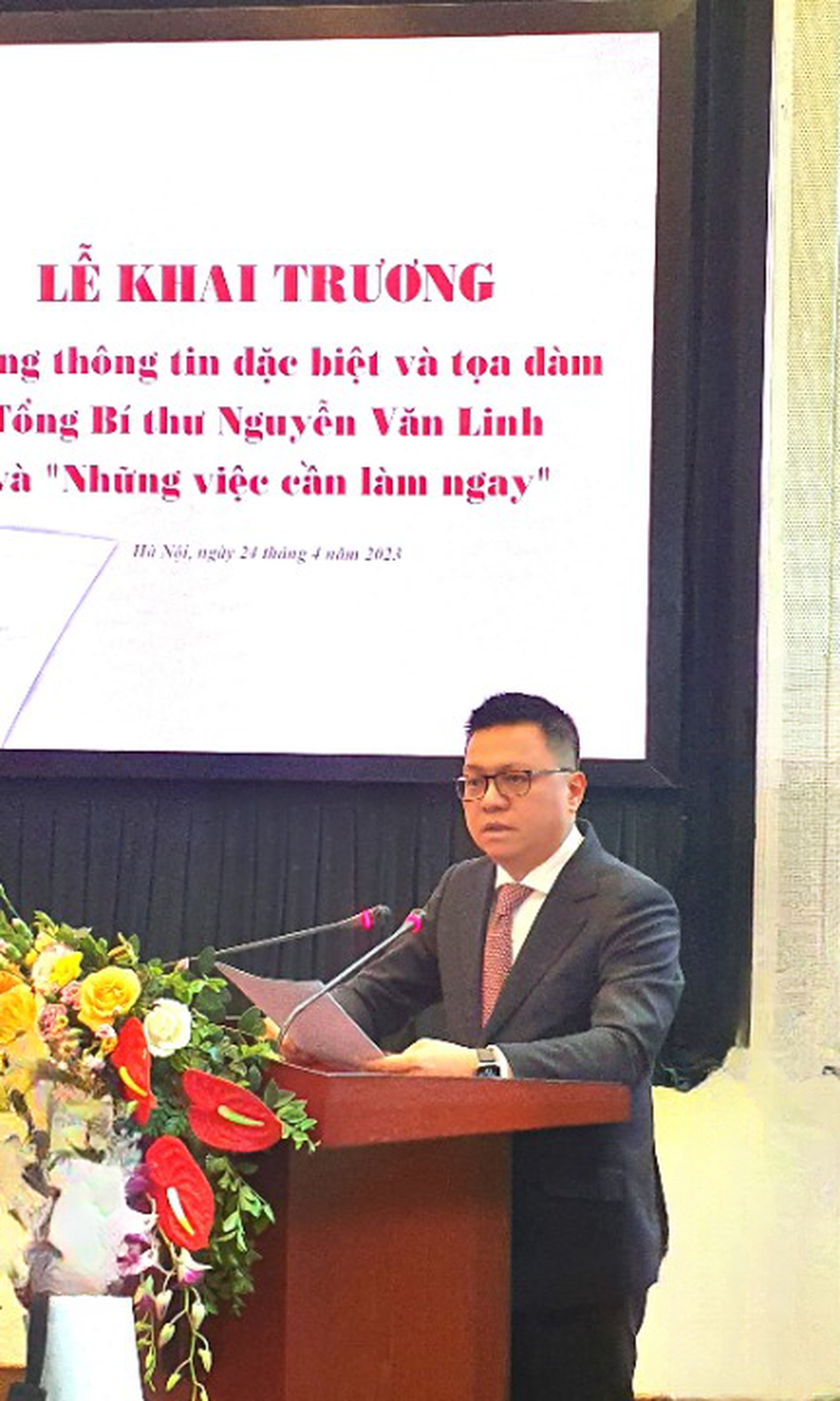 Tổng Biên tập Báo Nhân dân Lê Quốc Minh phát biểu tại buổi ra mắt trang thông tin đặc biệt về Tổng Bí thư Nguyễn Văn Linh. Ảnh: Hoàng Nam