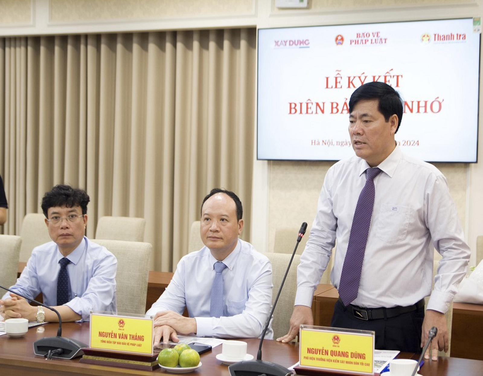 Phát biểu tại lễ ký kết, ông Bùi Xuân Dũng - Thứ trưởng Bộ Xây dựng đánh giá cao những đóng góp tích cực của các cơ quan báo chí trong thời gian qua, đồng thời mong muốn, sau lễ ký kết này, ba cơ quan báo chí: Báo Xây dựng, Báo Bảo vệ pháp luật và Báo Thanh tra tiếp tục gắt kết, chia sẻ thông tin trong mọi hoạt động của ngành và lĩnh vực chuyên môn.