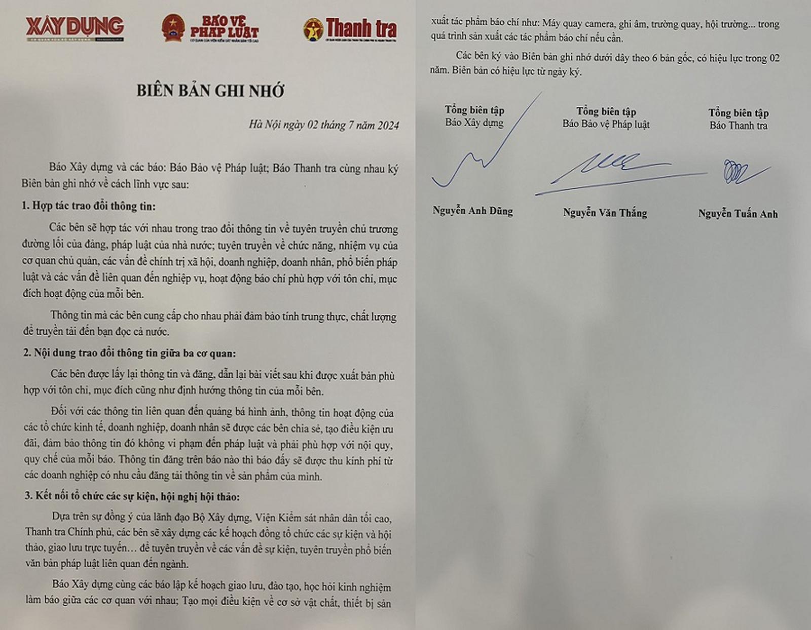 Căn cứ chức năng, nhiệm vụ của mỗi bên, Ban Biên tập 3 cơ quan báo chí gồm: Báo Xây dựng, Báo Bảo vệ pháp luật, Báo Thanh tra đã thống nhất nội dung ký kết biên bản ghi nhớ về các lĩnh vực sau: