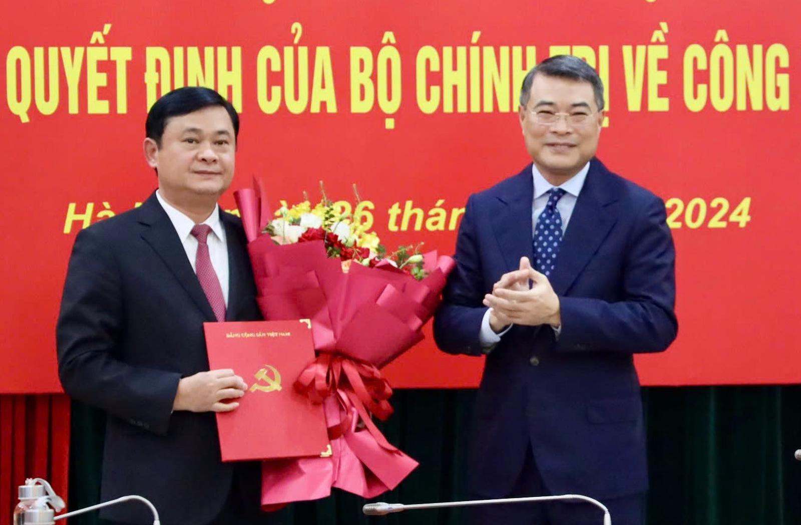Trưởng Ban Tổ chức Trung ương Lê Minh Hưng trao quyết định, tặng hoa chúc mừng tân Phó Trưởng Ban Kinh tế Trung ương Thái Thanh Quý. Ảnh: T. Chung