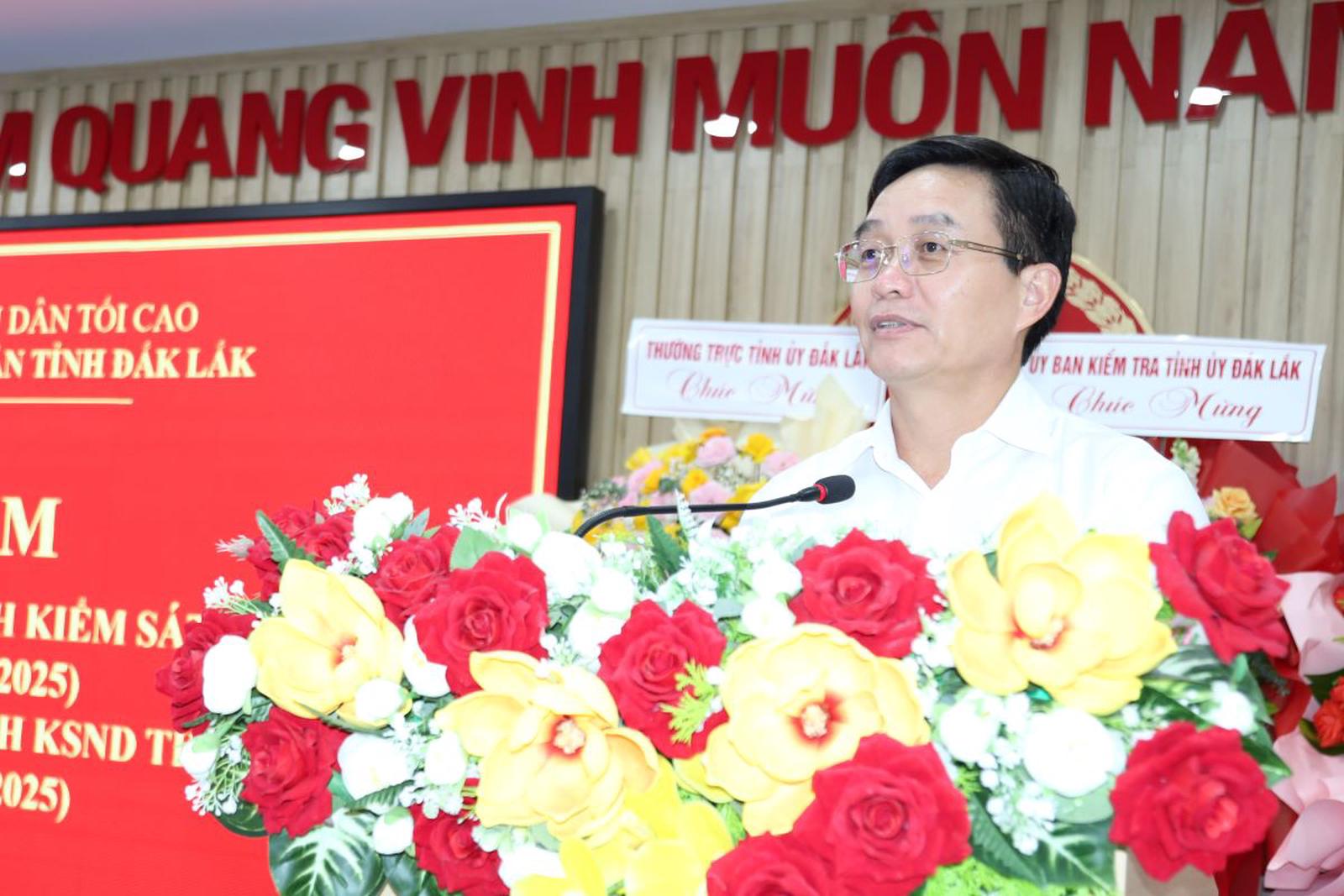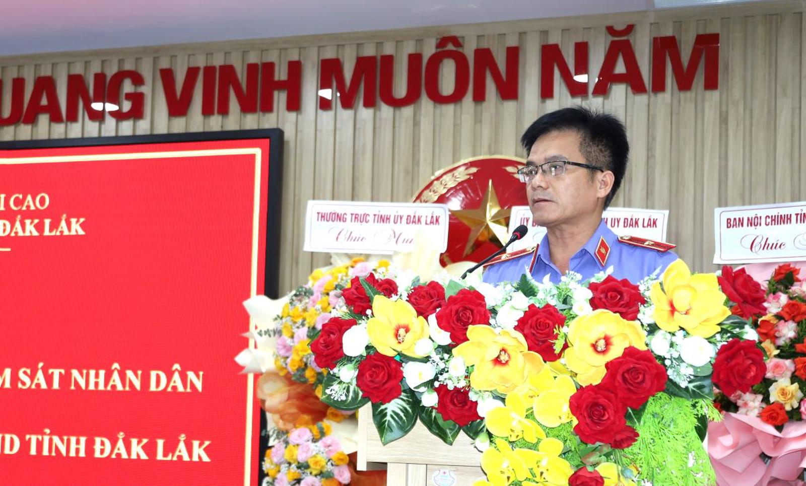 Phát biểu tại buổi lễ, đồng chí Nguyễn Đình Trung, Bí thư Tỉnh ủy Đắk Lắk biểu dương những kết quả mà ngành Kiểm sát tỉnh đạt được, nhấn mạnh Viện KSND là lực lượng nòng cốt trong bảo vệ công lý, pháp chế xã hội chủ nghĩa.