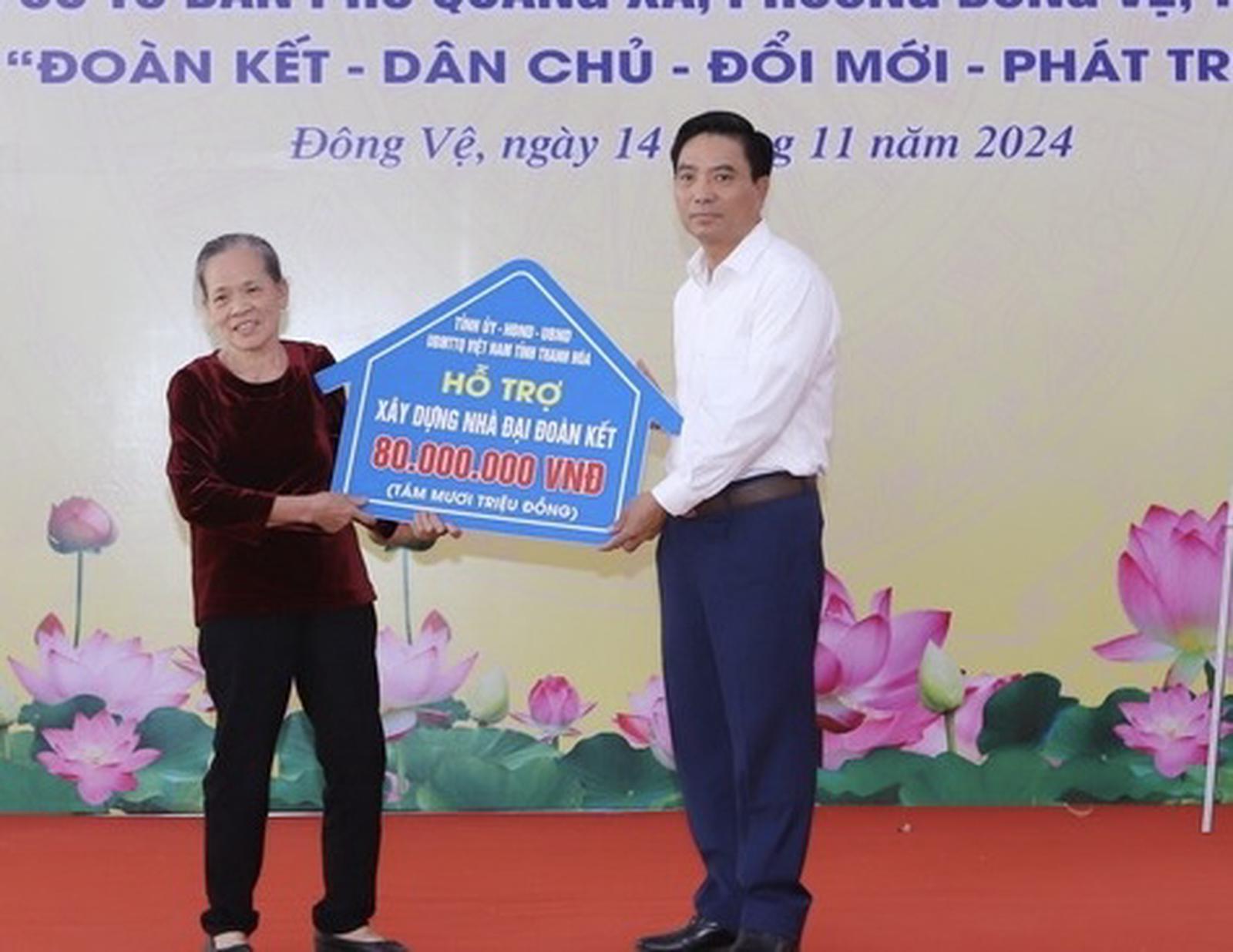 Bí thư Tỉnh uỷ Thanh Hoá trao 80 triệu đồng tiền hỗ trợ xây dựng nhà đại đoàn kết cho hộ gia đình ông Lê Hữu Hải, ở phố Kiều Đại, phường Đông Vệ. Ảnh: MH