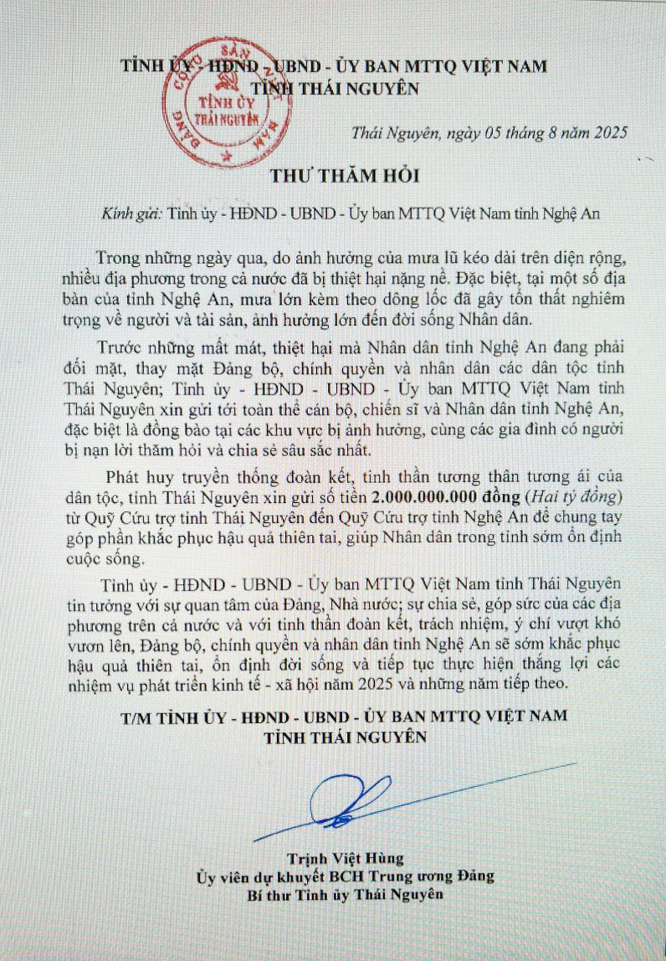 Trước những mất mát, thiệt hại mà Nhân dân các tỉnh nói trên đang phải đối mặt, thay mặt Đảng bộ, chính quyền và Nhân dân các dân tộc tỉnh Thái Nguyên, ông Trịnh Việt Hùng, Ủy viên dự khuyết Trung ương Đảng, Bí thư Tỉnh ủy Thái Nguyên, đã có Thư thăm hỏi gửi tới toàn thể cán bộ, chiến sĩ và Nhân dân các tỉnh Nghệ An, Điện Biên, Sơn La.