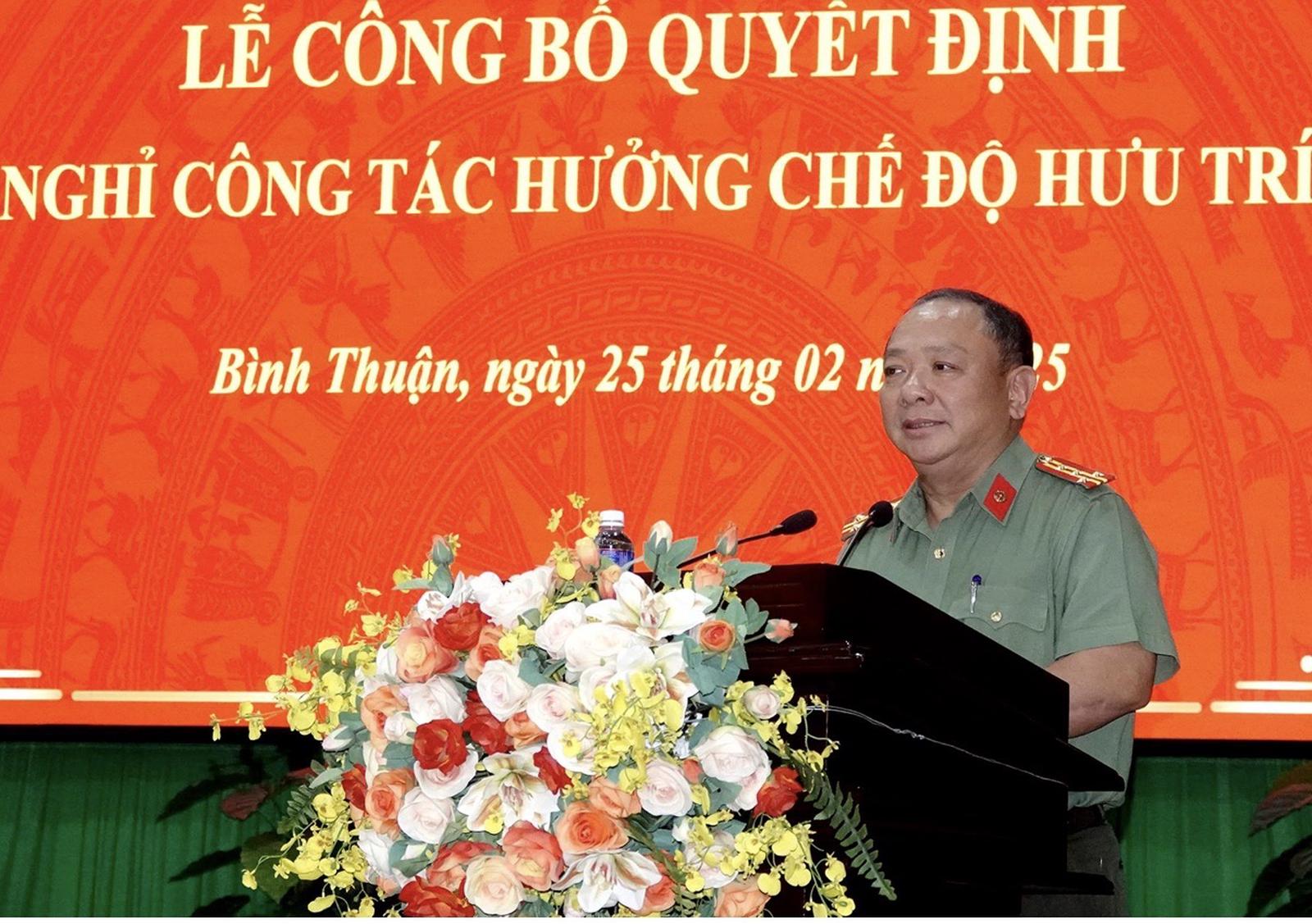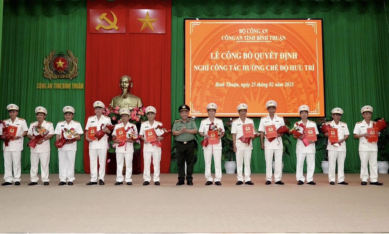 23 lãnh đạo Công an cấp phòng, cấp huyện tỉnh Bình Thuận nhận quyết định nghỉ hưu. Ảnh: TT Dân