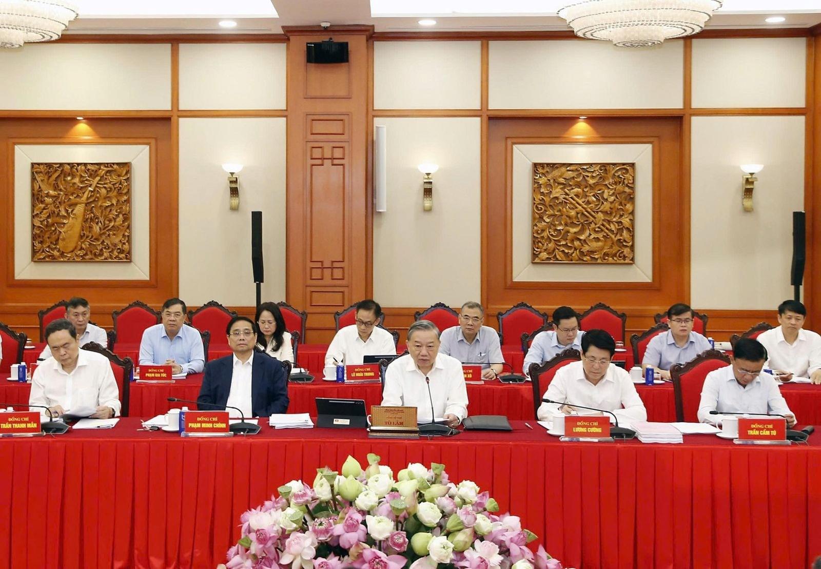 Tổng Bí thư Tô Lâm chủ trì buổi làm việc của Bộ Chính trị với Ban Thường vụ Thành ủy TP Hà Nội và Ban Thường vụ TP HCM để cho ý kiến dự thảo văn kiện, đề án nhân sự nhiệm kỳ 2025 - 2030. Ảnh: TTXVN