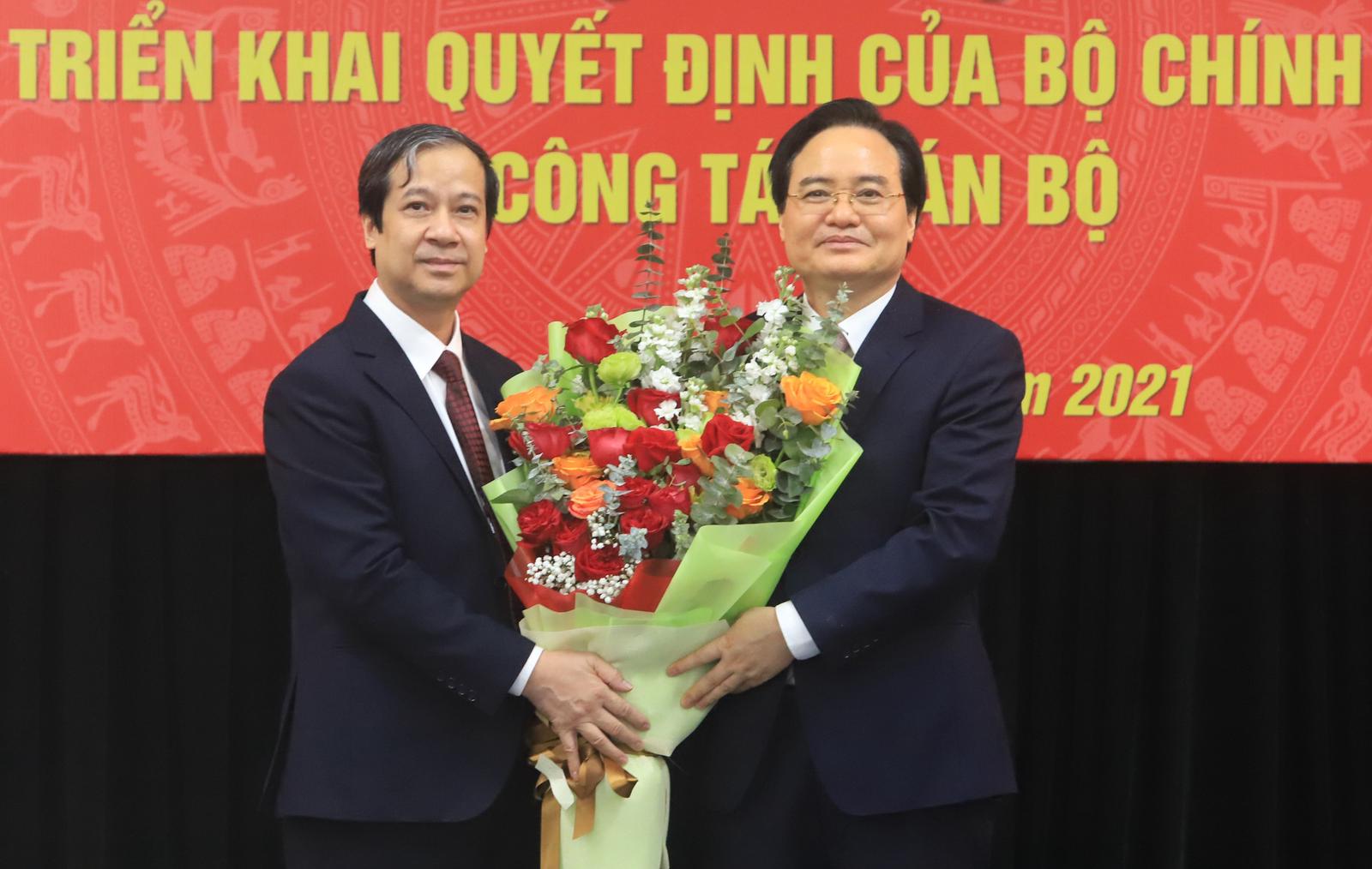 Bộ trưởng Bộ Giáo dục và Đào tạo Nguyễn Kim Sơn tăng hoa chúc mừng tân Phó Ban Tuyên giáo Trung ương Phùng Xuân Nhạ. Ảnh: Đ.X