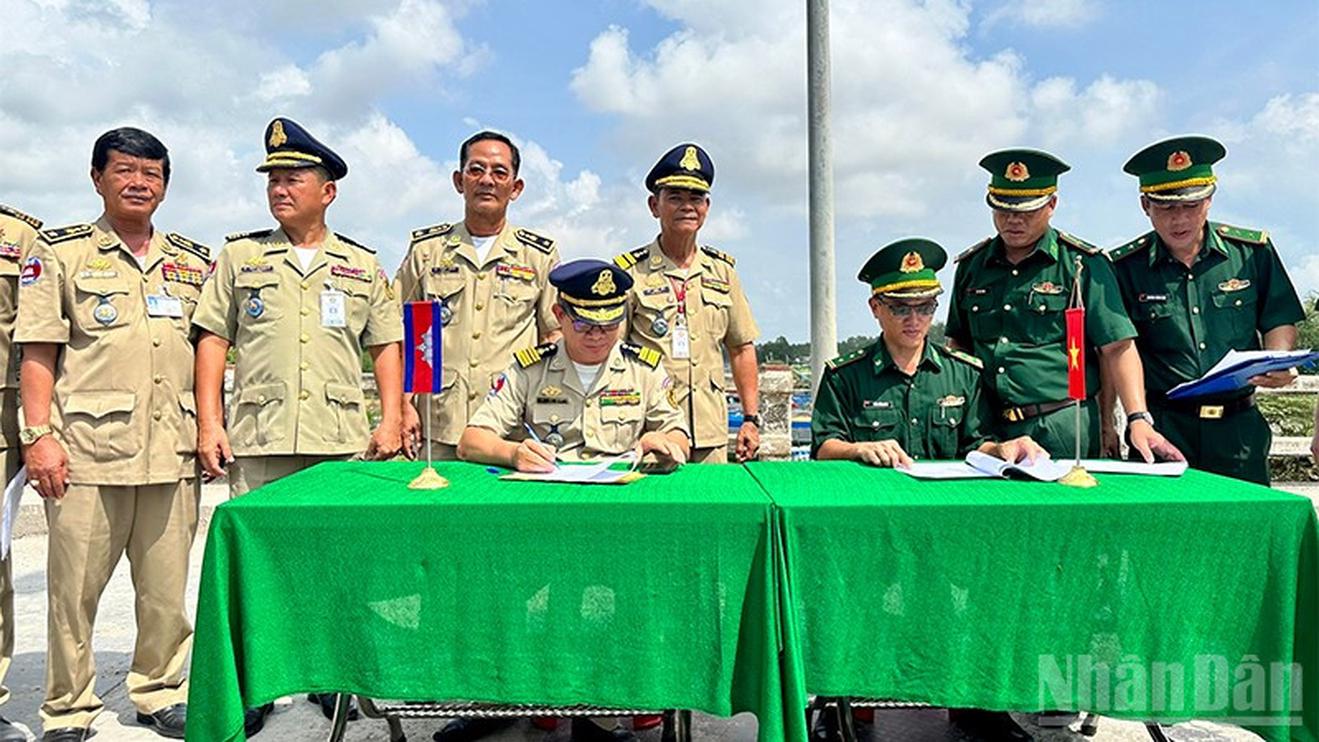 Đồn Biên phòng Cửa khẩu quốc tế Dinh Bà và lực lượng chức năng Campuchia ký biên bản giao nhận 57 công dân. Ảnh: PV