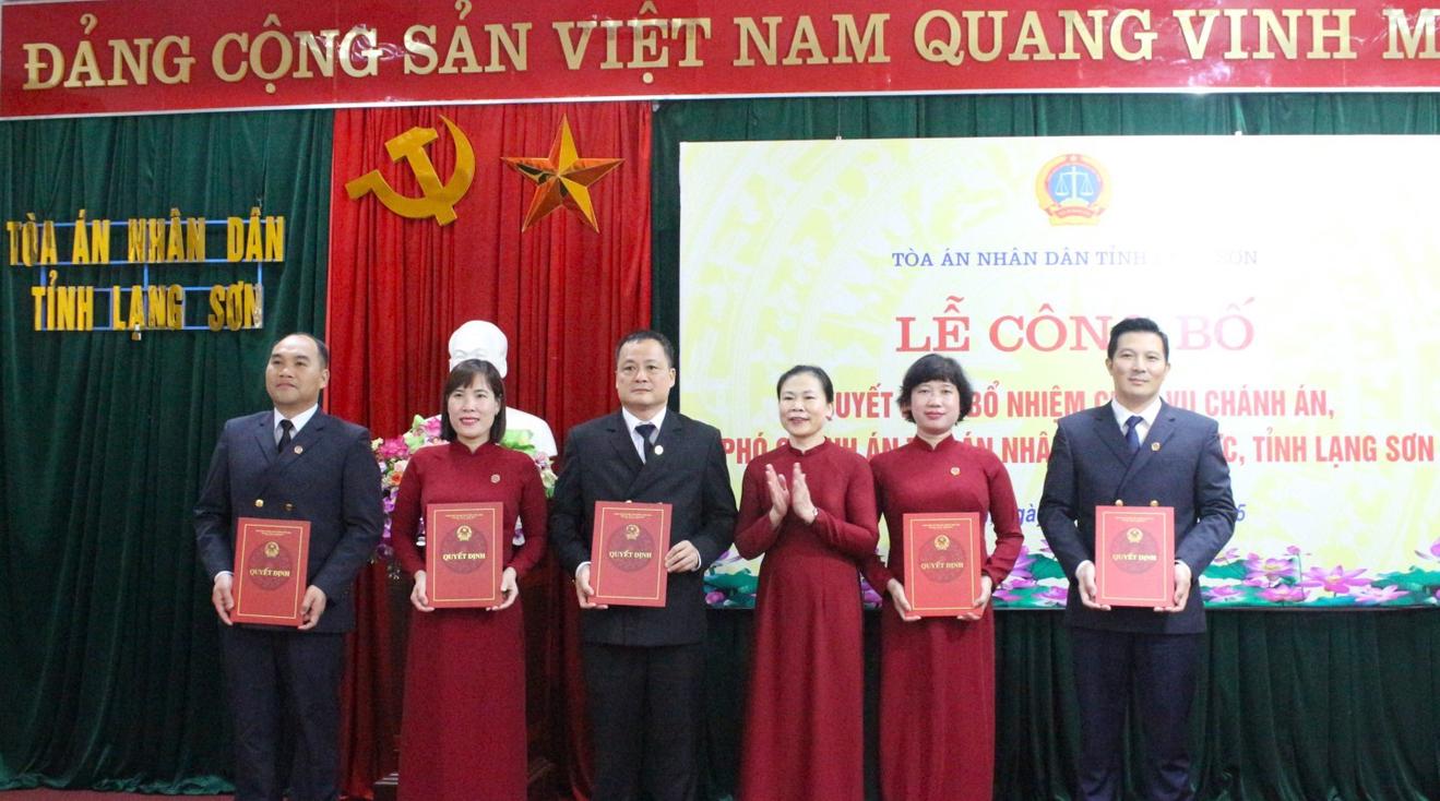 Chánh án TAND tỉnh Lạng Sơn trao quyết định bổ nhiệm chức vụ đối với 5 chánh án TAND các khu vực. Ảnh: BLS