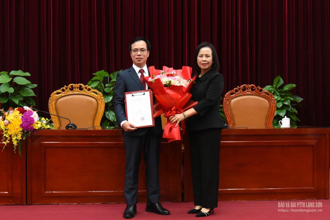 Phó Bí thư Thường trực Tỉnh ủy, Chủ tịch HĐND tỉnh Đoàn Thị Hậu trao quyết định, tặng hoa chúc mừng ông Vũ Quang Hưng. Ảnh: BLS