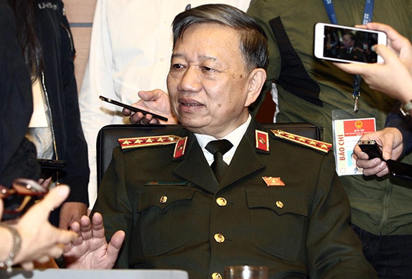 Bộ trưởng Công an Tô Lâm trao đổi với báo chí bên hành lang Quốc hội.