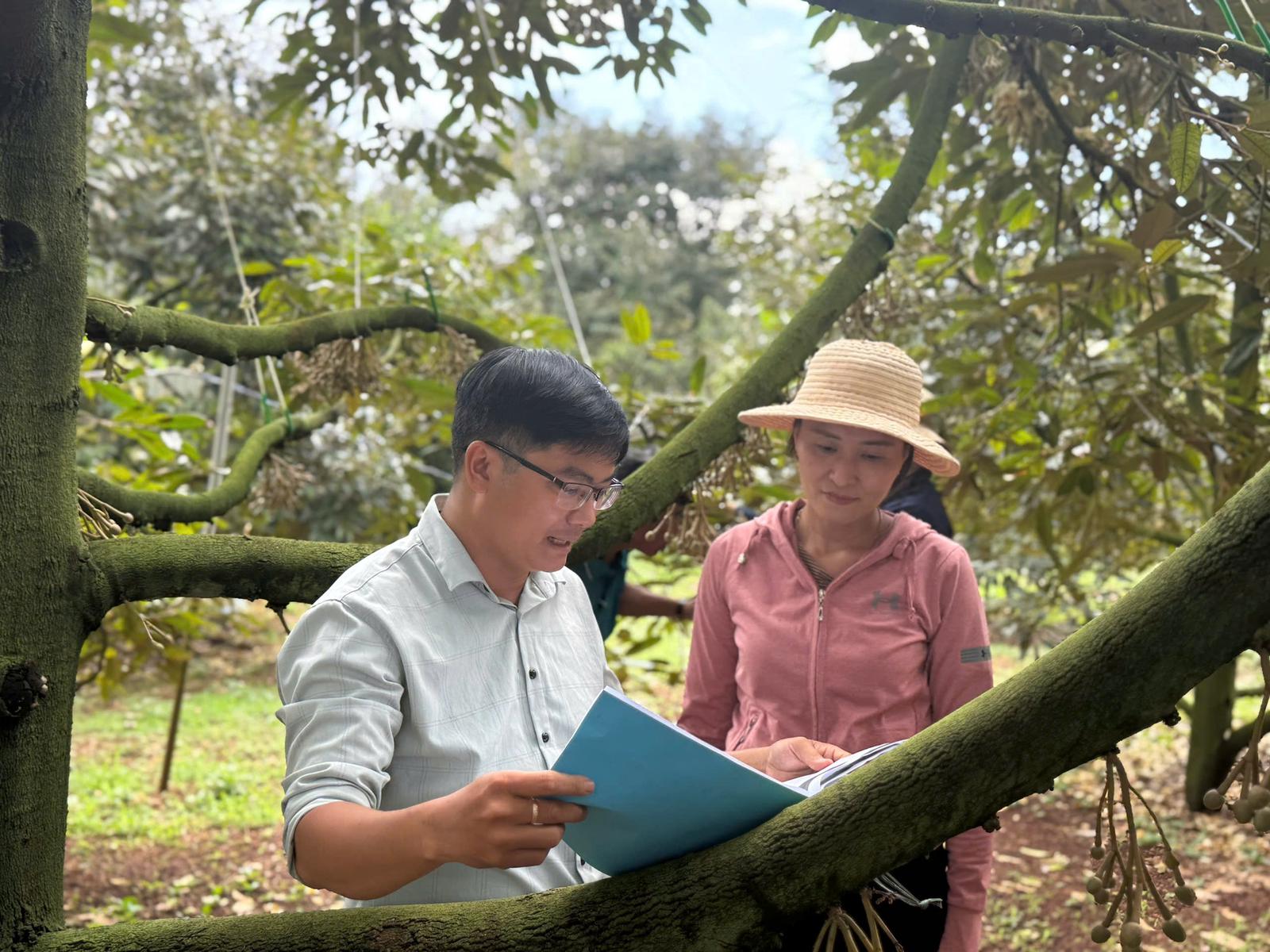 Đoàn đã thăm vùng trồng của Công ty TNHH TM Nông sản Thiện Tâm tại thôn Tân Bắc, xã Ea Kênh, huyện Krông Pắc. Đây là một trong những doanh nghiệp lớn tại Đắk Lắk chuyên thu mua, sơ chế và đóng gói sầu riêng, hiện đang quản lý 18 mã vùng trồng với tổng diện tích trên 655 ha.
