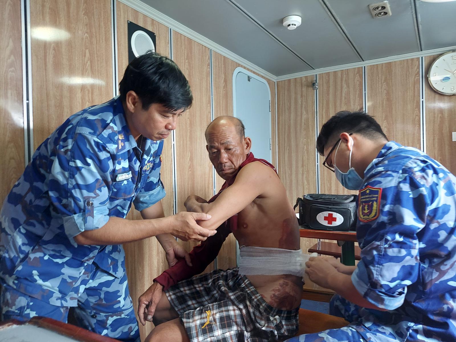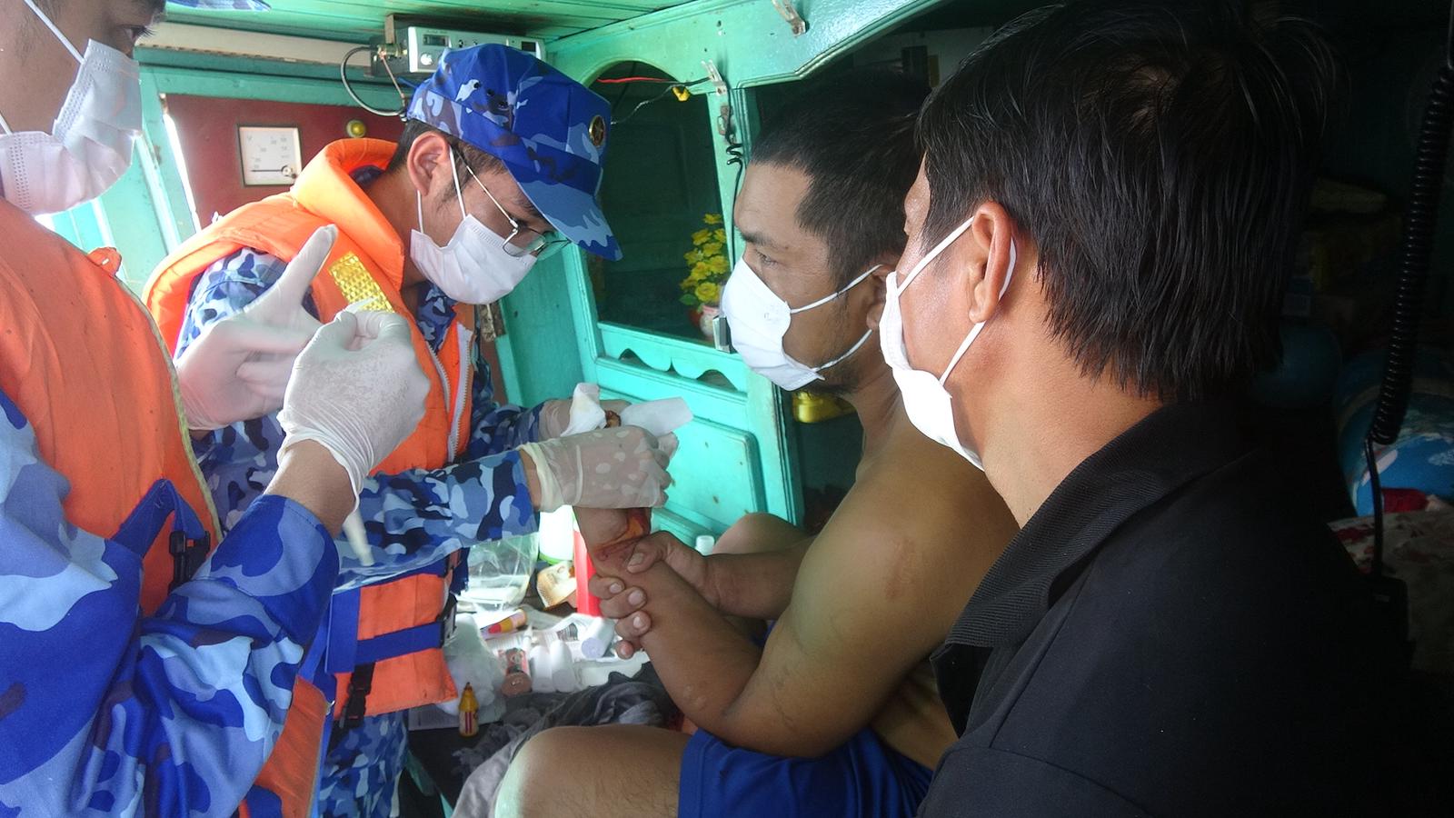 Cán bộ, chiến sĩ BTL Vùng Cảnh sát biển 4 băng bó, cấp cứu cho ngư dân gặp nạn trên biển. Ảnh: CSB4